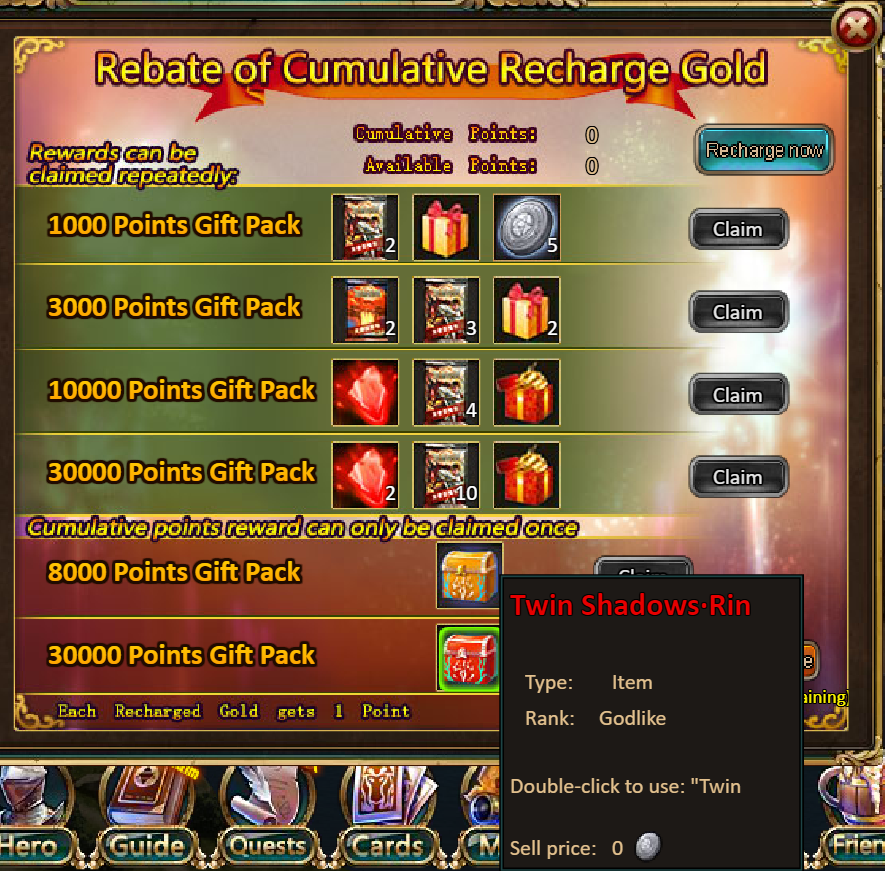 5.Cumulative Gold Rebate: 8000 - Twin Shadows·Rin (Legendary) / 30000 - Twin Shadows·Rin (Godlike)