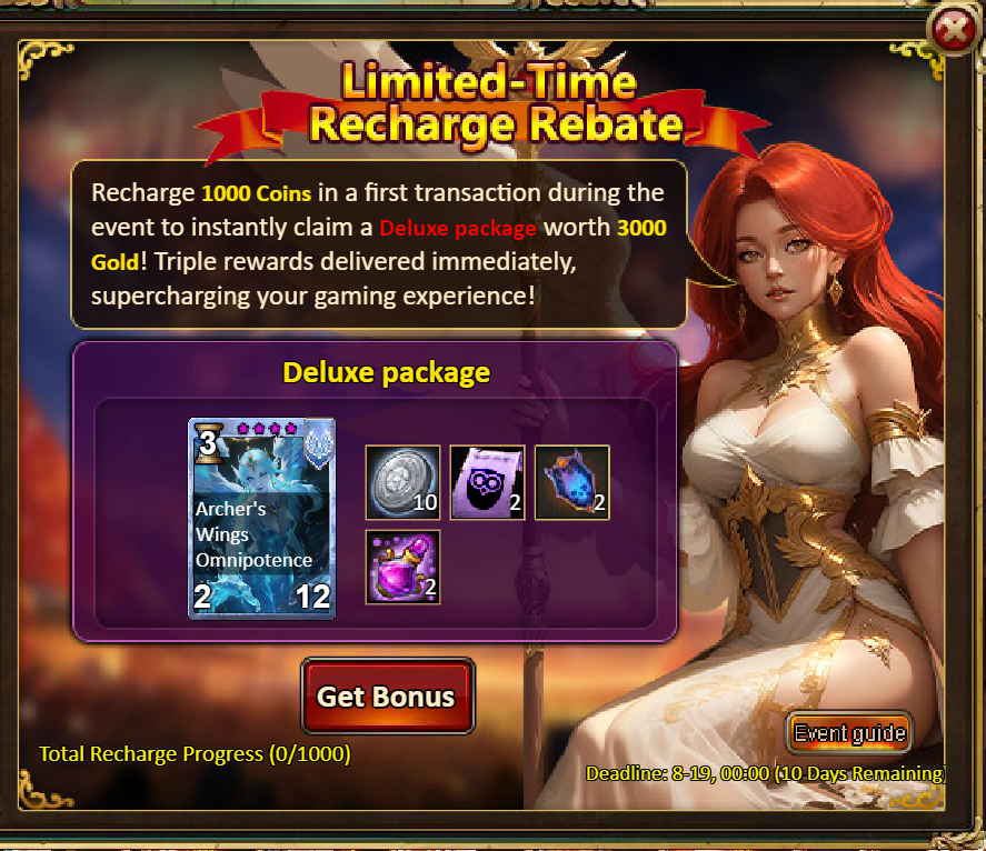 3.Recharge Rebate: Elixia (Epic)*1 / Silver*100,000 / Pet Magic Realm Ticket*2 / Dark Champion Potion*2 / Tome Hall Ticket*2