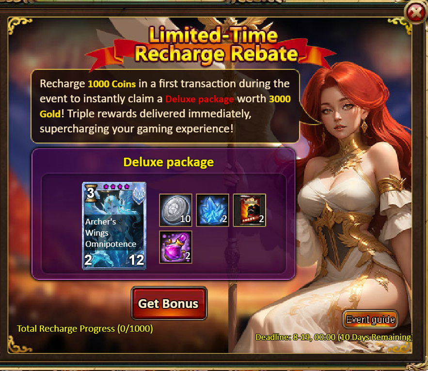 3.Recharge Rebate: Elixia (Epic) / Silver*100,000 / Maste’s Skill Pack III*2 / Dark Champion Potion*2 / Crystal Gift Box*2