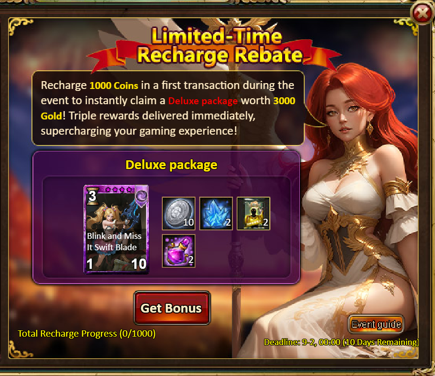 3.Recharge Rebate: Swift Blade Grace (Epic) / Silver*100,000 / Maste’s Skill Pack IV*2 / Dark Champion Potion*2 / Crystal Gift Box*2