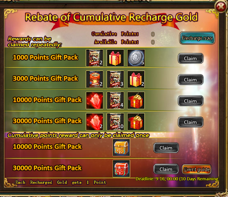 3.Recharge Rebate: Angel Lucia (Epic) / Silver*100,000 / Pet Magic Realm Ticket*2 / Dark Champion Potion*2 / Tome Hall Ticket*2