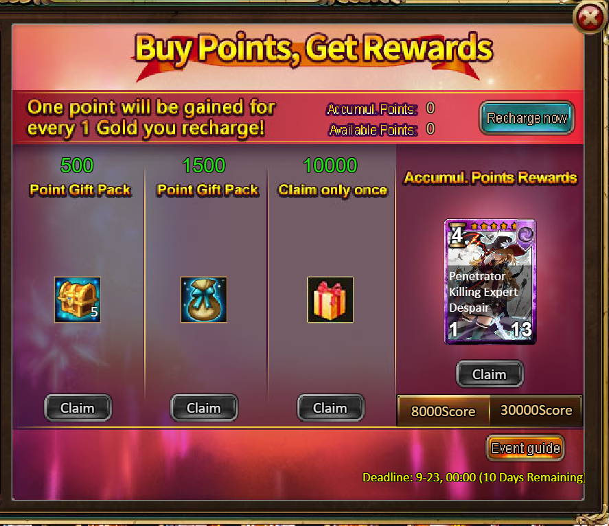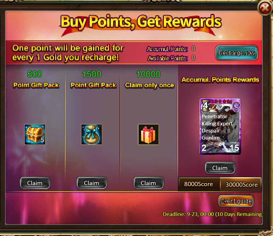 4.Buy Points, Get Rewards: 8000 - Reina the Gunmaster (Legendary) / 30000 - Reina the Gunmaster (Godlike)