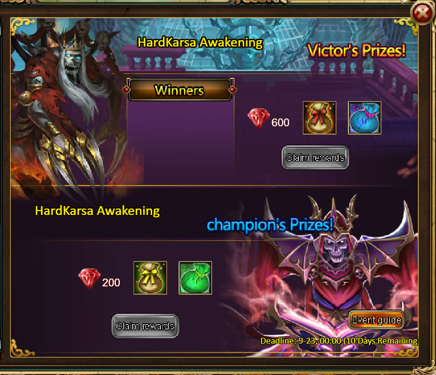 3.Recharge Rebate: Demon Asher (Epic)*1 / Silver*100,000 / Mystic Valley Ticket*2 / Dark Champion Potion*2 / Tome Hall Ticket*2 / Ruby Fragment*5