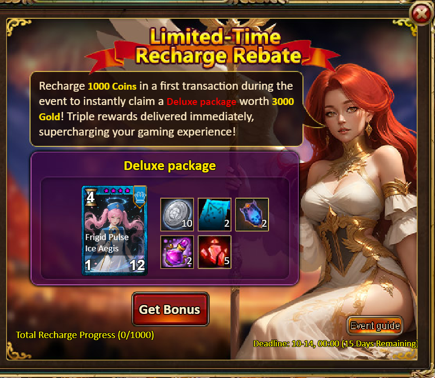 3.Recharge Rebate: Frost Bilu (Epic) / Silver*100,000 / Mystical Valley Ticket*2 / Dark Champion Potion*2 / Tome Hall Ticket*2 / Ruby Fragment*5