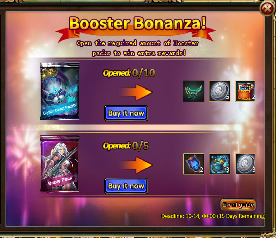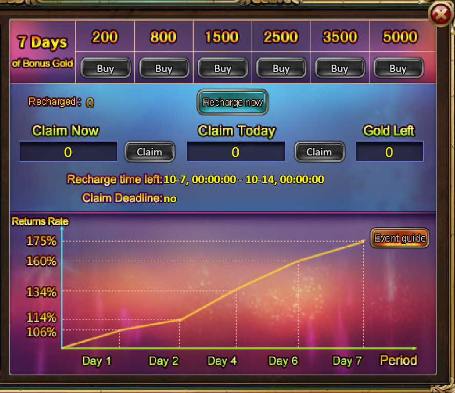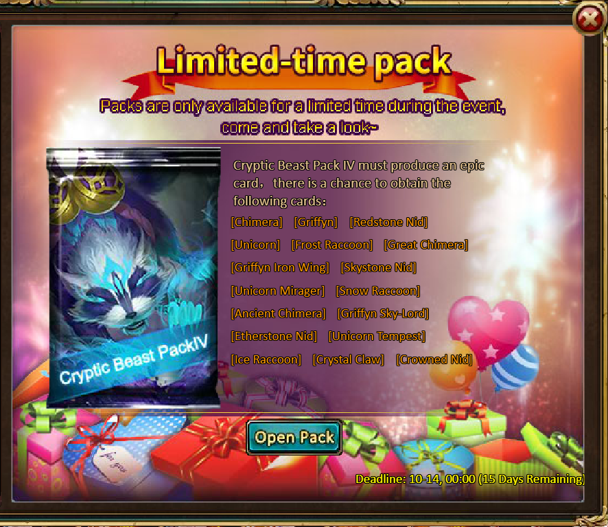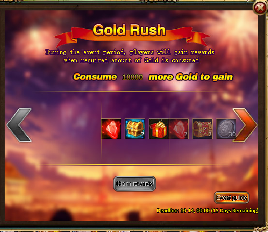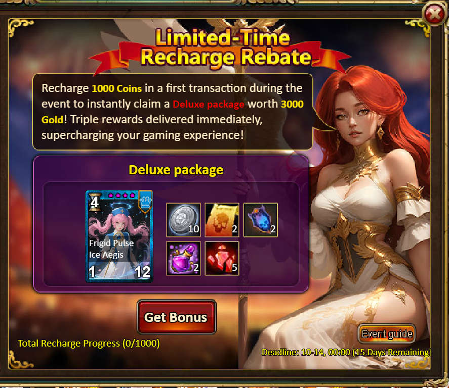 Dear Players: Time-limited events of King’s call [b]will be updated at 0:00 on October 7, 2025, Beijing time[/b]. The following are the main contents of this event period: [b][Event][/b] [b]1.Supremacy: Danika Flameheart 2.Red Diamond Storm: Red Diamond*2000 / Dragon Box*1 / Silver*50,000 3.Recharge Rebate: Frost Bilu (Epic)*1 / Silver*100,000 / Chaotic Wastes Ticket*2 / Dark Champion Potion*2 / Tome Hall Ticket*2 / Ruby Fragment*5 4.Buy Points, Get Rewards: 8000 - Queen Leanara (Legendary)*1 / 30000 - Chika the Gentle (Godlike)*1 5.Cumulative Gold Rebate: 11000 - Yue Lao Pack (Includes Yue Lao (Legendary)*1 + Molten Mooncake Relic (Legendary)*1) / 30000 - Yue Lao (Godlike)*1 6.Legend Returns 7.7-Day Fund 8.Value Rebates 9.Directory of Myths (Winning Buddha) 10.Event of Dragon Ball 11.Gold Rush (Weekly Event)[/b] [u]Consume 10,000 gold coins: Fire Ruby*1, Solar Chest (Legendary)*2. Pet Pleasure*1 Consume 30,000 gold coins: Fire Ruby*2, Godlike Box*2, Silver*3,000,000 Consume 50,000 gold coins: Black Opal*1, Solar Chest (Legendary)*4, Pet Pleasure*5 Consume 70,000 gold coins: Fire Ruby*2, Godlike Box*4, Silver*4,000,000 Consume 90,000 gold coins: Black Opal*1, Godlike Box*6, Solar Chest (Legendary)*6, Silver*5,000,000[/u] [b]12.Spend Daily, Get Rewards[/b] [u]Consume 100 gold coins: Fusion Catalyst*1, Silver*10,000, Tower Ticket*3 Consume 500 gold coins: Human Box (Rare)*1, Fusion Catalyst*2, Inferno Ticket*2 Consume 1,000 gold coins: Chaotic Wastes Ticket*3, Angel Box (Rare)*2, Guardian Rune Recipe (Epic)*2 Consume 2,000 gold coins: Lunar Chest (Epic)*1, Fodder (Legendary)*10, Inferno Ticket*5 Consume 5,000 gold coins: Chaotic Wastes Ticket*3, Unbound Skill Tome Shard (Good)*10, Fire Opal*1 Consume 10,000 gold coins: Fire Ruby*1, Advanced Fusion Catalyst*1, Silver*1,000,000[/u] [b]13.Pack (Limited Time Event) - Booster Bonanza[/b] [u]10 packs of Master’s Skill Pack V - Flame Bird Fragment*40 / Pet Feast*2 / Unbound Skill Tome Shard (Good)*5 10 packs of Festival Pack - Moonlit Hare (7-Day) *1 / Starlight Chest (Epic)*1 / Silver*500,000 10 packs of Cryptic Beast Pack IV - Moonlight Saddle (7-Day) *1 / Legendary Box*2 / Silver*500,000 5 packs of Brave Pack - Elixir of Energy (10 Points)*3 / Tome Hall Ticket*2 / Silver*300,000[/u] [b]14.Chaotic Wastes 15.Karsa Awakening 16.Ascension Tower[/b] See the pictures for details. The event content is subject to the game content. The official has the final right of interpretation.