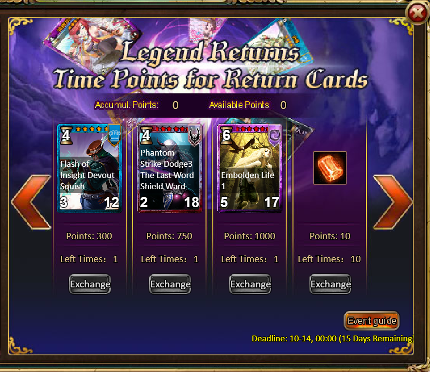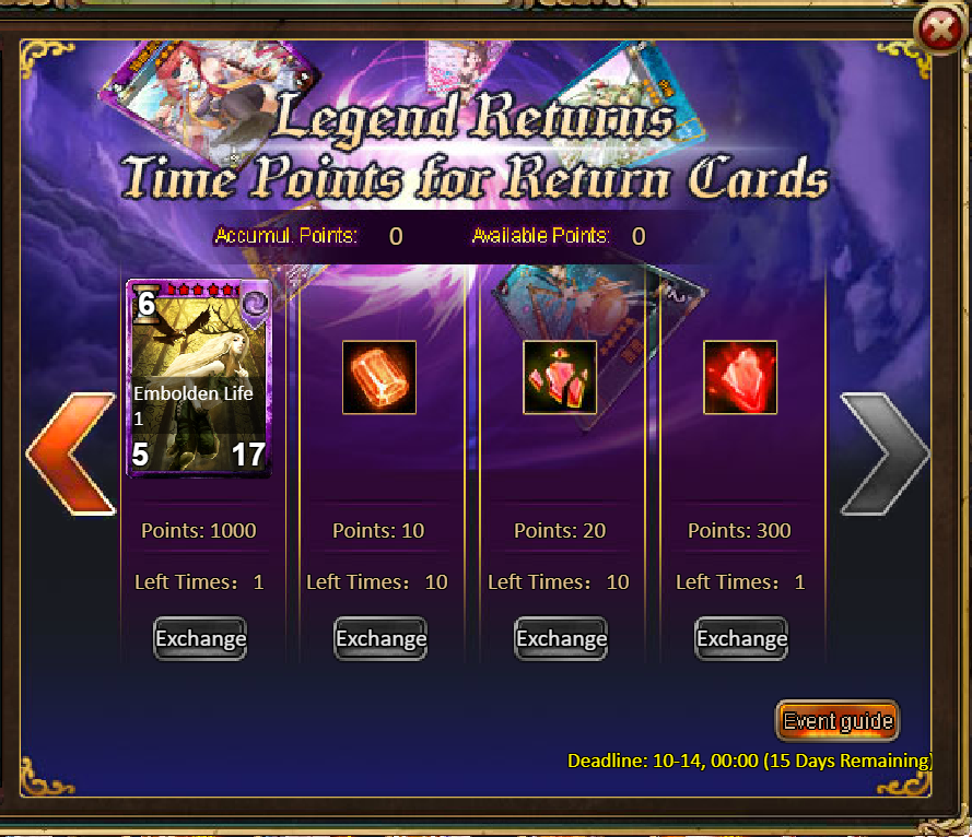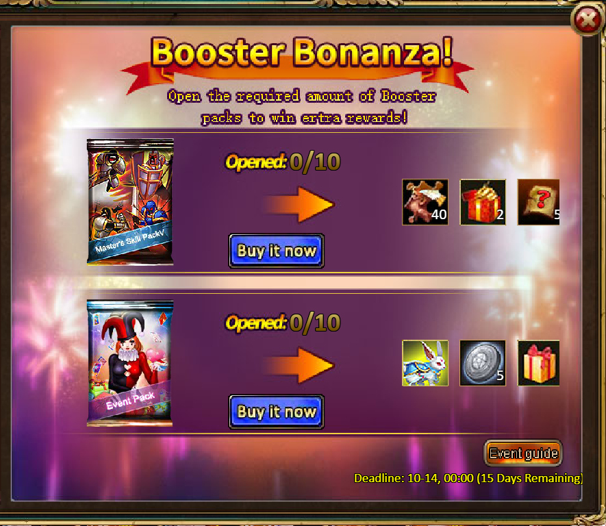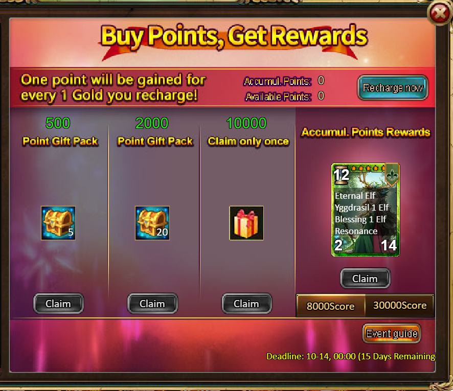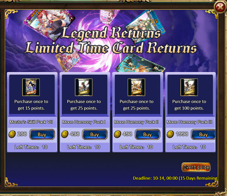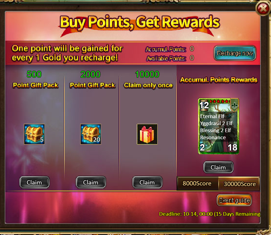 Dear Players: Time-limited events of King’s call [b]will be updated at 0:00 on October 7, 2025, Beijing time[/b]. The following are the main contents of this event period: [b][Event][/b] [b]1.Supremacy: Danika Flameheart 2.Red Diamond Storm: Red Diamond*2000 / Dragon Box*1 / Silver*50,000 3.Recharge Rebate: Frost Bilu (Epic)*1 / Silver*100,000 / Chaotic Wastes Ticket*2 / Dark Champion Potion*2 / Tome Hall Ticket*2 / Ruby Fragment*5 4.Buy Points, Get Rewards: 8000 - Queen Leanara (Legendary)*1 / 30000 - Chika the Gentle (Godlike)*1 5.Cumulative Gold Rebate: 11000 - Yue Lao Pack (Includes Yue Lao (Legendary)*1 + Molten Mooncake Relic (Legendary)*1) / 30000 - Yue Lao (Godlike)*1 6.Legend Returns 7.7-Day Fund 8.Value Rebates 9.Directory of Myths (Winning Buddha) 10.Event of Dragon Ball 11.Gold Rush (Weekly Event)[/b] [u]Consume 10,000 gold coins: Fire Ruby*1, Solar Chest (Legendary)*2. Pet Pleasure*1 Consume 30,000 gold coins: Fire Ruby*2, Godlike Box*2, Silver*3,000,000 Consume 50,000 gold coins: Black Opal*1, Solar Chest (Legendary)*4, Pet Pleasure*5 Consume 70,000 gold coins: Fire Ruby*2, Godlike Box*4, Silver*4,000,000 Consume 90,000 gold coins: Black Opal*1, Godlike Box*6, Solar Chest (Legendary)*6, Silver*5,000,000[/u] [b]12.Spend Daily, Get Rewards[/b] [u]Consume 100 gold coins: Fusion Catalyst*1, Silver*10,000, Tower Ticket*3 Consume 500 gold coins: Human Box (Rare)*1, Fusion Catalyst*2, Inferno Ticket*2 Consume 1,000 gold coins: Chaotic Wastes Ticket*3, Angel Box (Rare)*2, Guardian Rune Recipe (Epic)*2 Consume 2,000 gold coins: Lunar Chest (Epic)*1, Fodder (Legendary)*10, Inferno Ticket*5 Consume 5,000 gold coins: Chaotic Wastes Ticket*3, Unbound Skill Tome Shard (Good)*10, Fire Opal*1 Consume 10,000 gold coins: Fire Ruby*1, Advanced Fusion Catalyst*1, Silver*1,000,000[/u] [b]13.Pack (Limited Time Event) - Booster Bonanza[/b] [u]10 packs of Master’s Skill Pack V - Flame Bird Fragment*40 / Pet Feast*2 / Unbound Skill Tome Shard (Good)*5 10 packs of Festival Pack - Moonlit Hare (7-Day) *1 / Starlight Chest (Epic)*1 / Silver*500,000 10 packs of Cryptic Beast Pack IV - Moonlight Saddle (7-Day) *1 / Legendary Box*2 / Silver*500,000 5 packs of Brave Pack - Elixir of Energy (10 Points)*3 / Tome Hall Ticket*2 / Silver*300,000[/u] [b]14.Chaotic Wastes 15.Karsa Awakening 16.Ascension Tower[/b] See the pictures for details. The event content is subject to the game content. The official has the final right of interpretation.