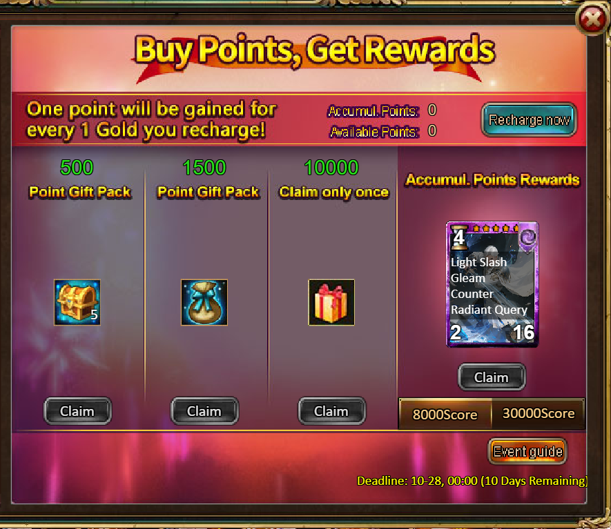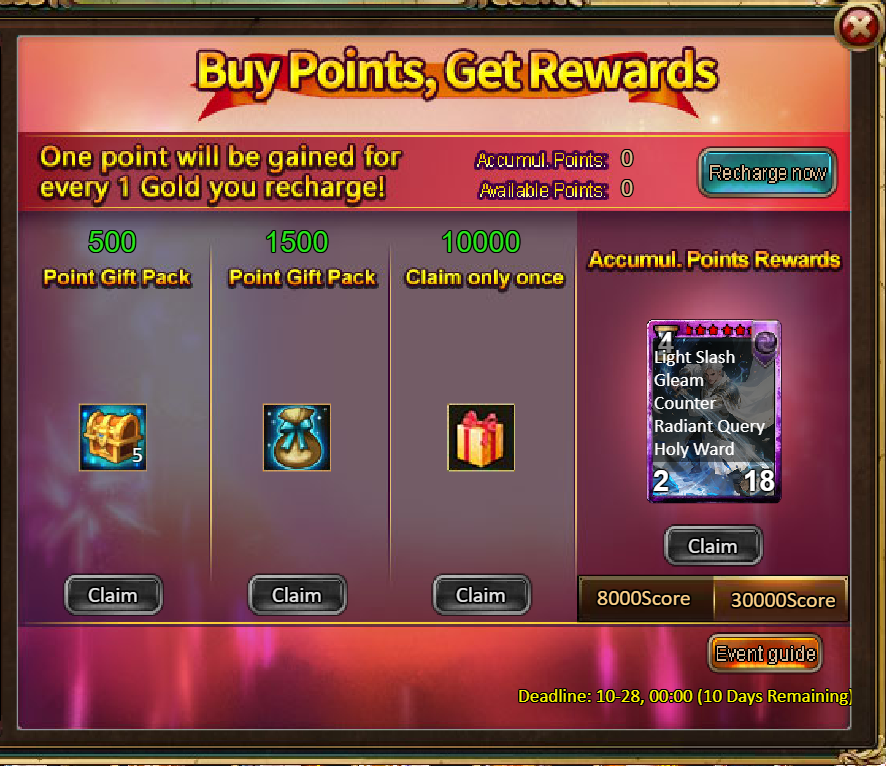 4.Buy Points, Get Rewards: 8000 - Radiant Arthur (Legendary)*1 / 30000 - Radiant Arthur (Godlike)*1
