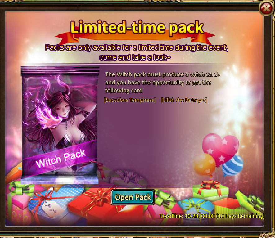 5 packs of Witch Pack - Elixir of Energy (10 Points)*3 / Tome Hall Ticket*2 / Silver*300,000