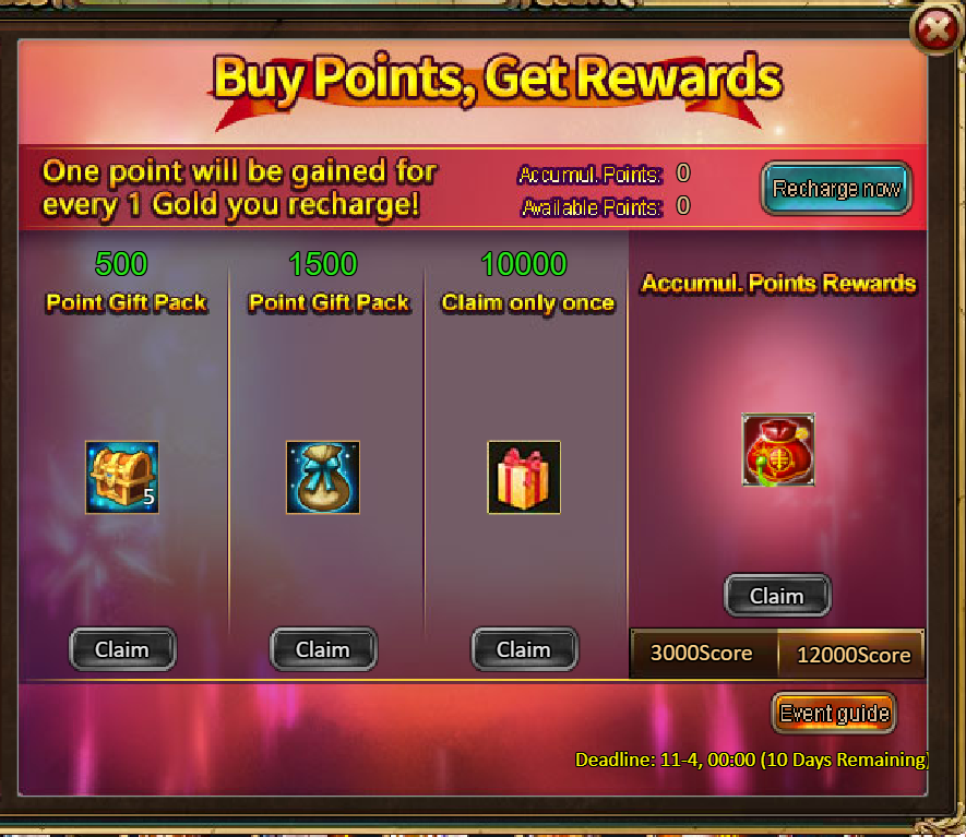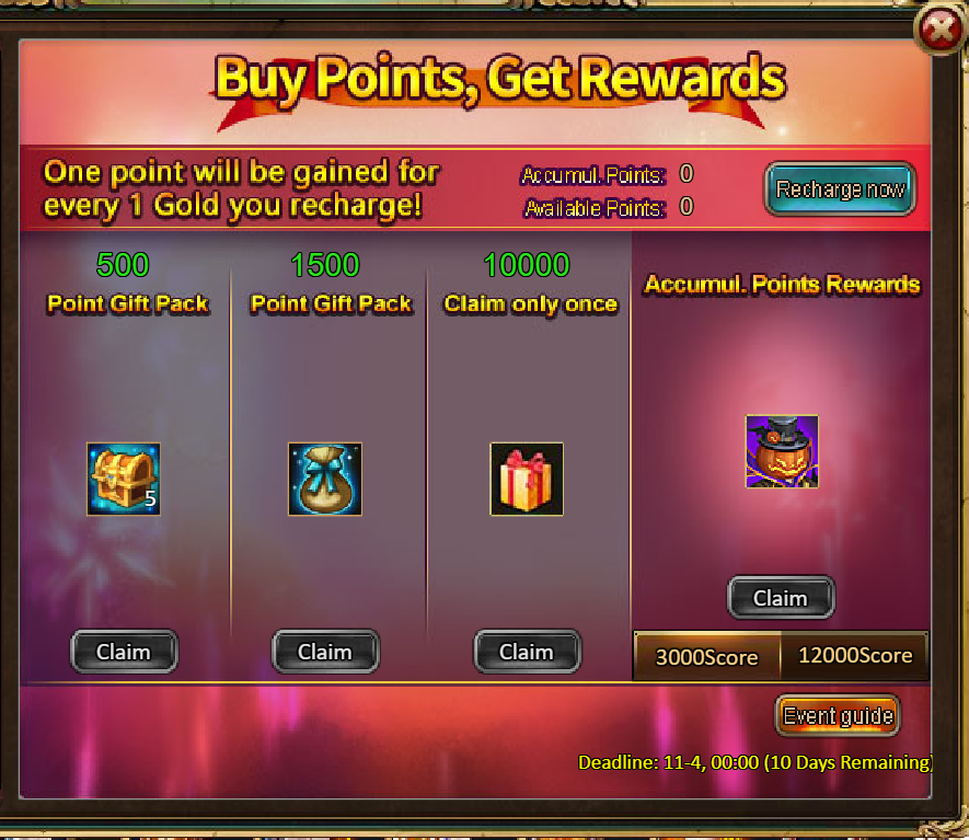4.Buy Points, Get Rewards: 3000 - Pumpkin Wraith (Good)*1 / 12000 - Halloween Deluxe Pack (includes Pumpkin Wraith (Legendary)*1+Pumpkin Candy (Legendary)*1)
