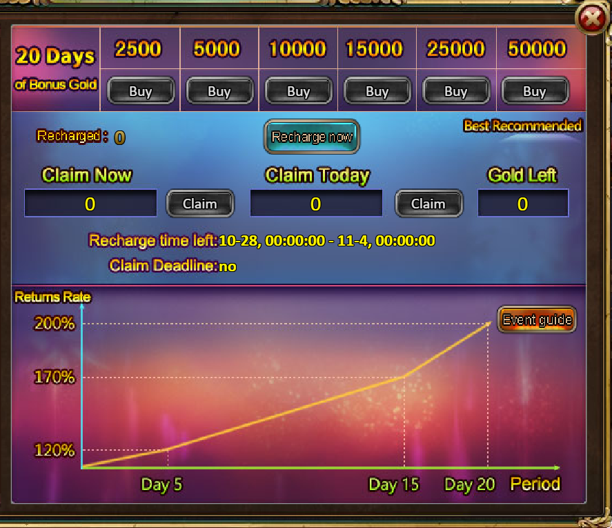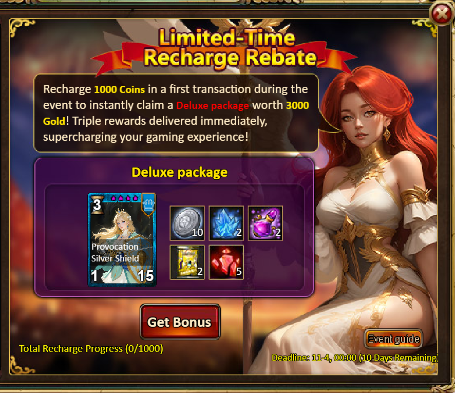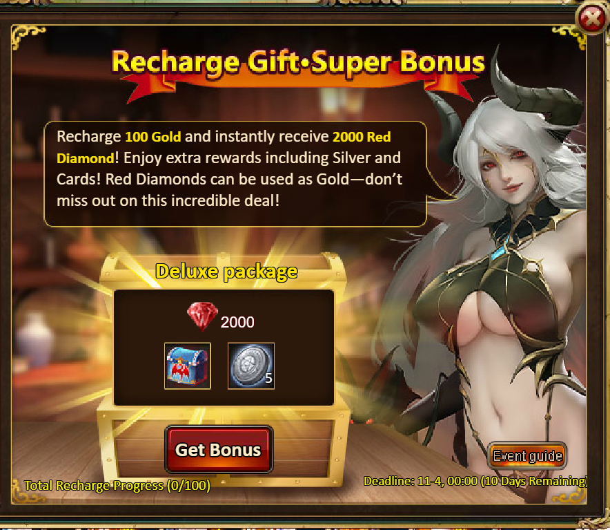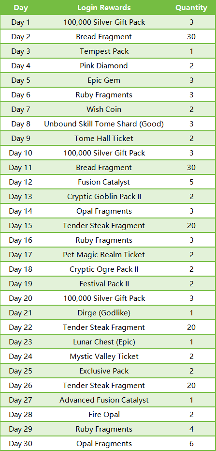 3.Recharge Rebate: Silver Guard (Epic) / Silver*100,000 / Crystal Gift Box*2 / Dark Champion Potion*2 / Master’s Skill Pack II*2 / Ruby Fragment*5
