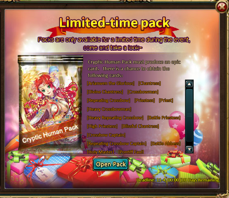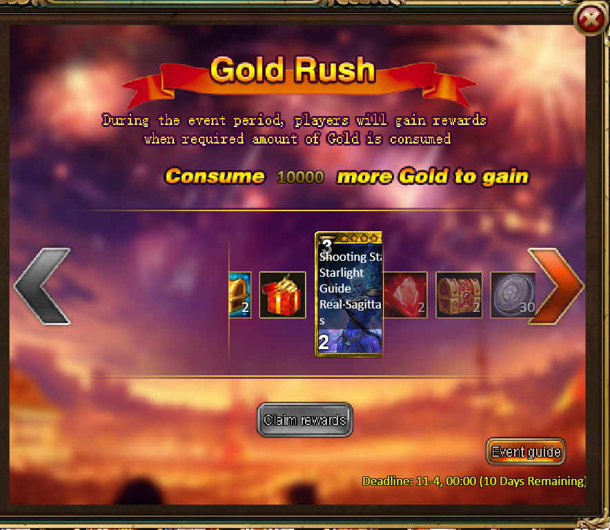 [u]Consume 10,000 gold coins: Sagittarius (Legendary)*1, Solar Chest (Legendary)*2. Pet Pleasure*1