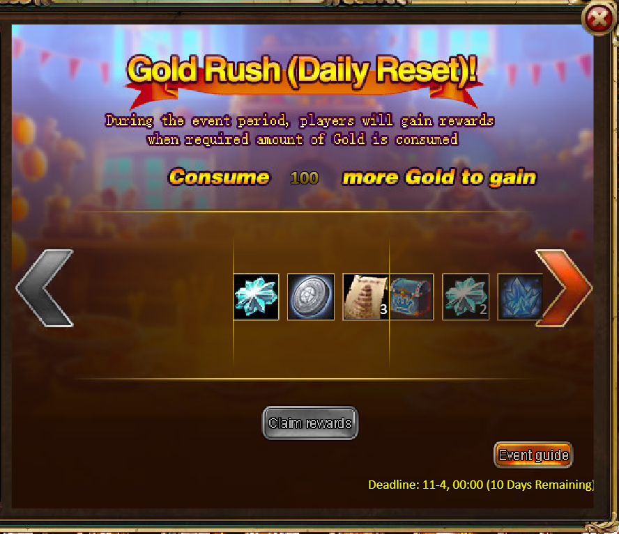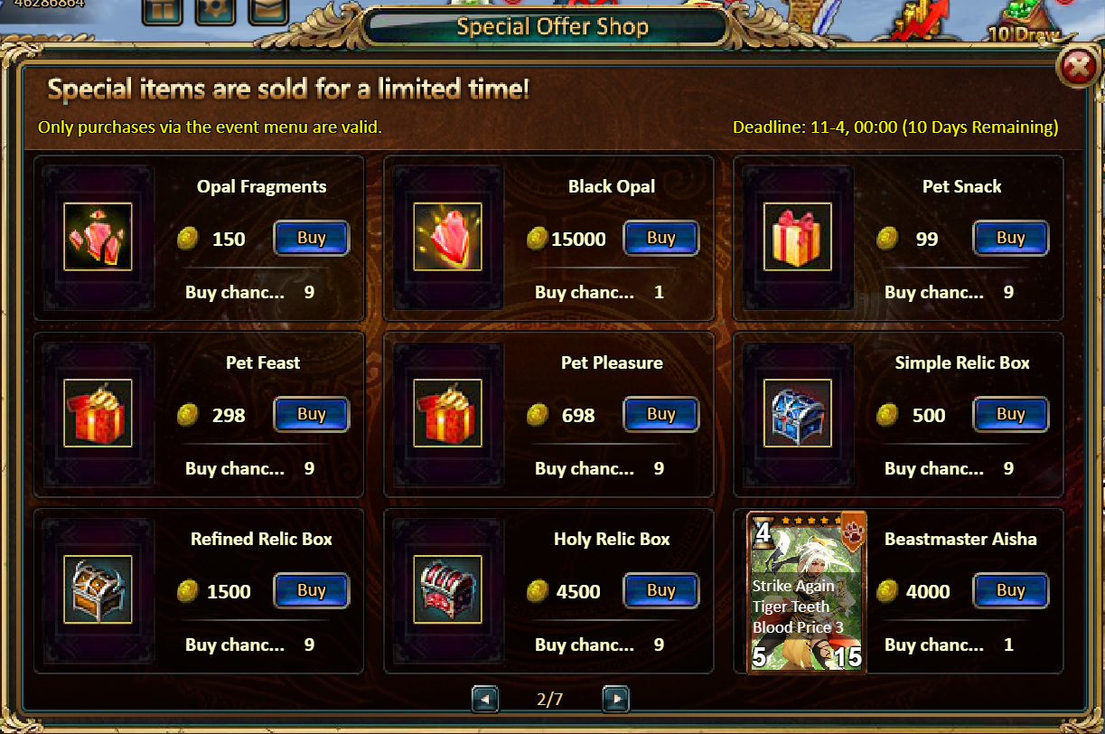 Consume 50,000 gold coins: Black Opal*1, Solar Chest (Legendary)*4, Pet Pleasure*5
