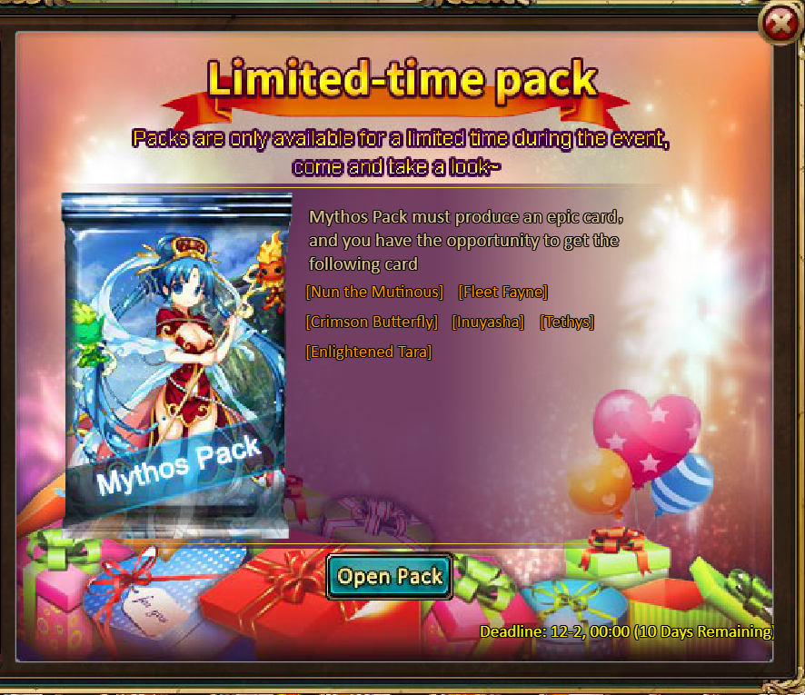 5 packs of Mythos Pack - Tome Hall Ticket*2 / Elixir of Energy (10 Points)*3 / Silver*300,000