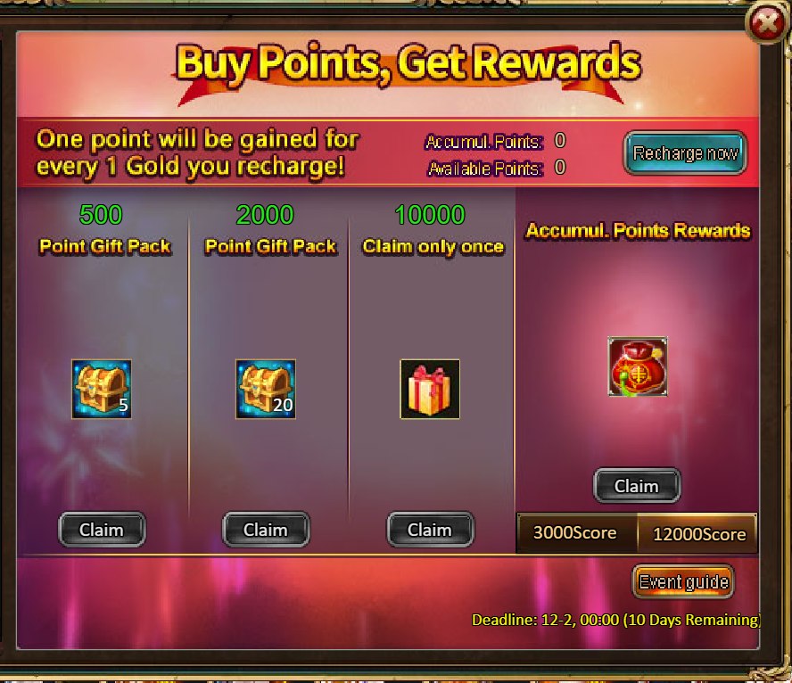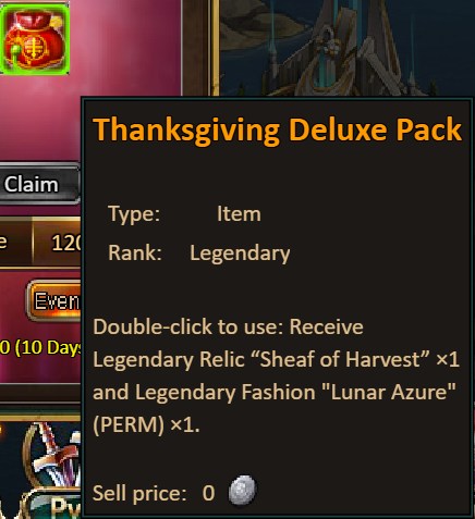 4.Buy Points, Get Rewards: 3000 - Maple Breeze (Good)*1 / 12000 -Thanksgiving Deluxe Pack (Includes: Maple Breeze (Legendary) *1 + Sheaf of Harvest (Legendary) *1)
