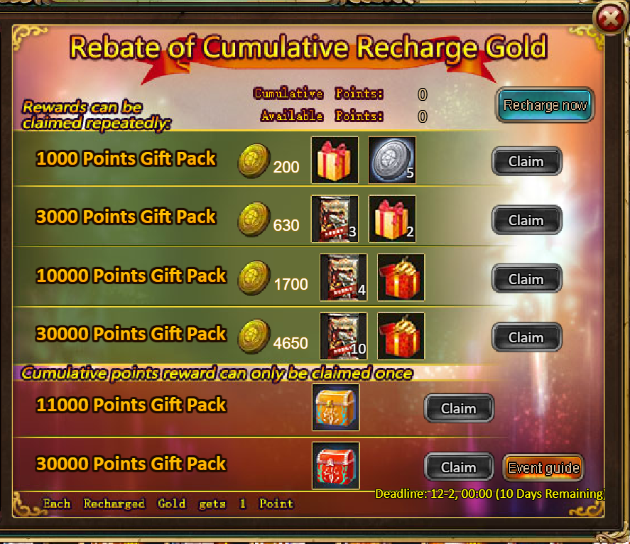 3.Recharge Rebate: Iron Enforcers (Epic)*1 / Silver*100,000 / Pet Magic Realm Ticket*2 / Dark Champion Potion*2 / Tome Hall Ticket*2 / Ruby Fragment*5