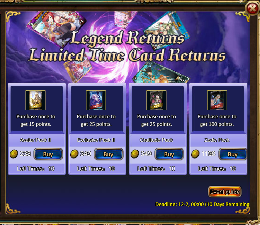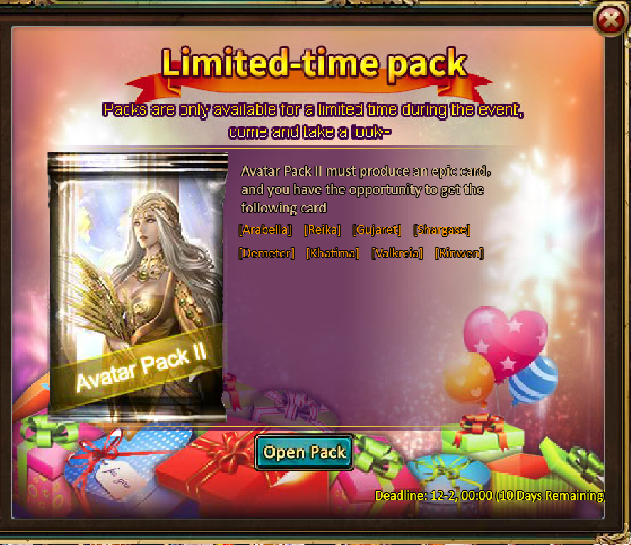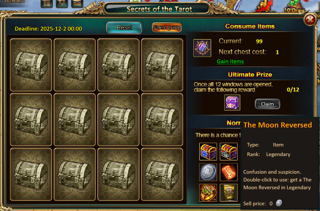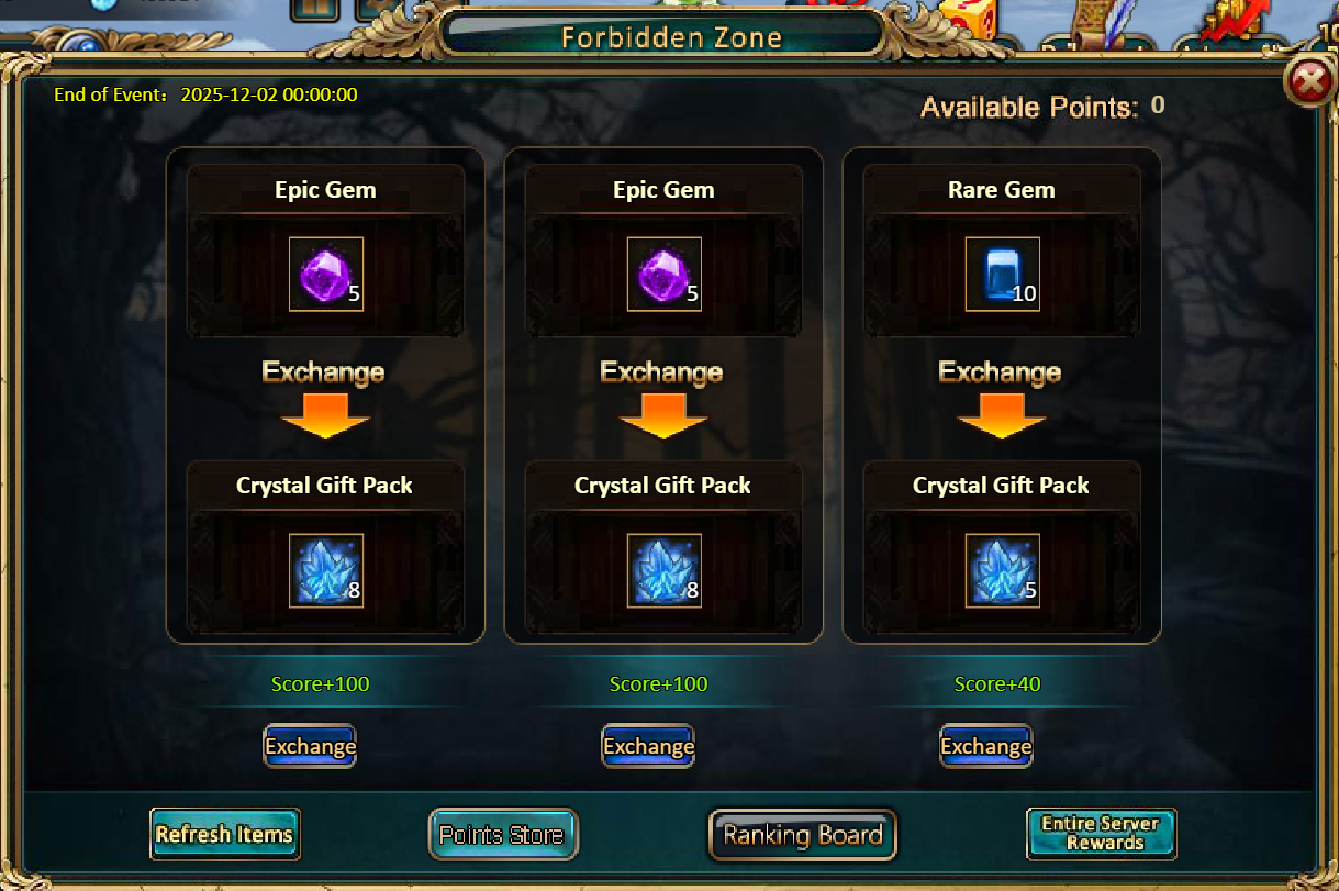 Consume 90,000 gold coins: Black Opal*1, Godlike Box II*6, Solar Chest (Legendary)*6, Silver*5,000,000[/u]