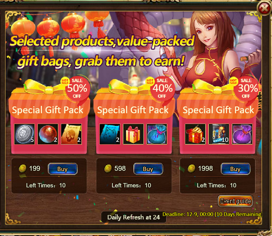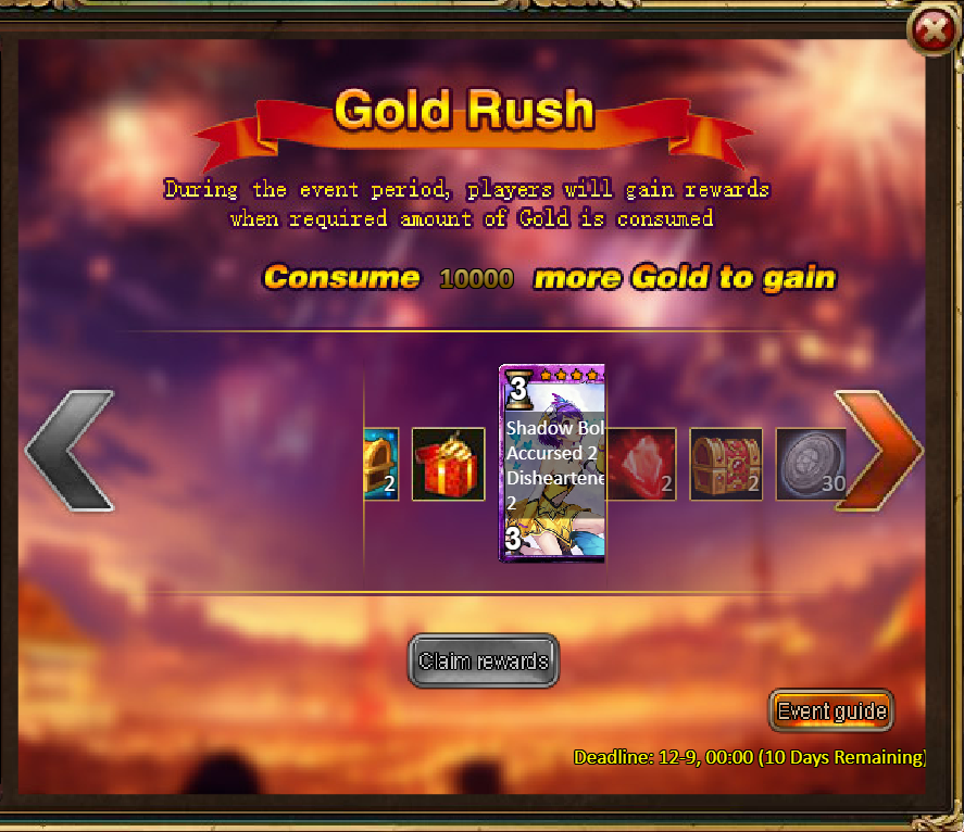 Consume 30,000 gold coins: Fire Ruby*2, Godlike Box II*2, Silver*3,000,000