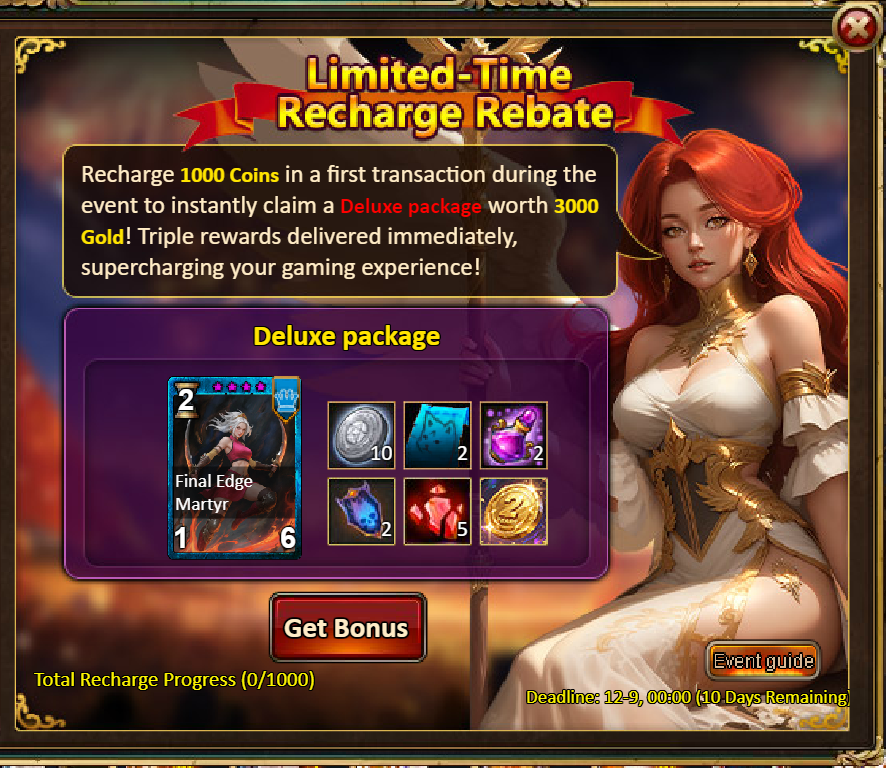 3.Recharge Rebate: Grassland Guardian Rita (Epic) / Silver*100,000 / Mystical Valley Ticket*2 / Dark Champion Potion*2 / Tome Hall Ticket*2 / Ruby Fragment*5/2nd Anniversary Coin*1