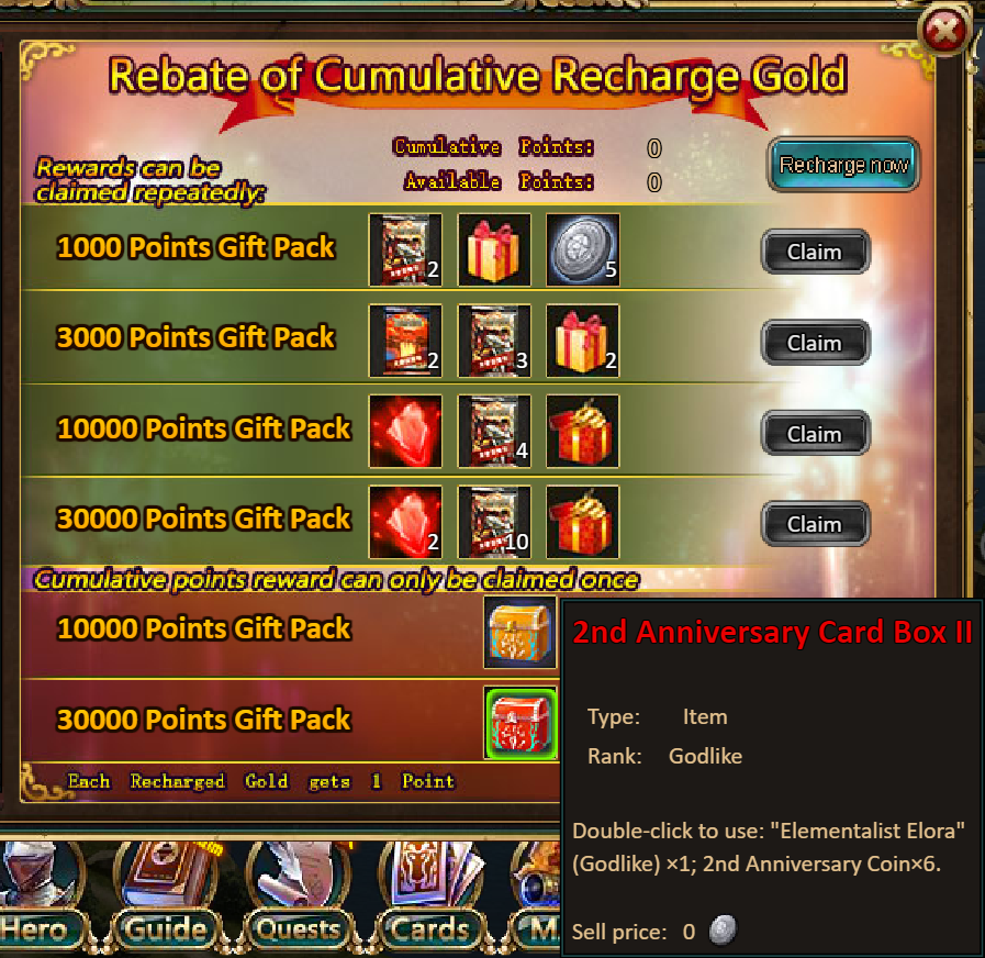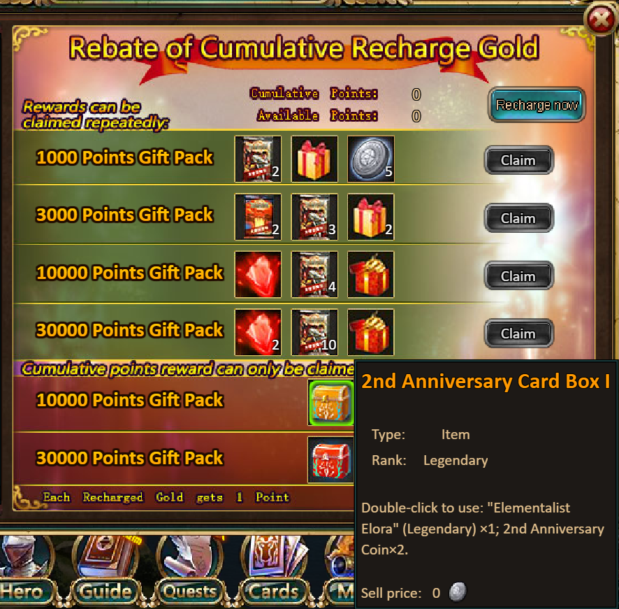 5.Cumulative Gold Rebate: 10000 - 2nd Anniversary Card Box I--(Elementalist Elora Legendary*1, 2nd Anniversary Coin*2)/ 30000 – 2nd Anniversary Card Box II--(Elementalist Elora Godlike*1, 2nd Anniversary Coin*6)