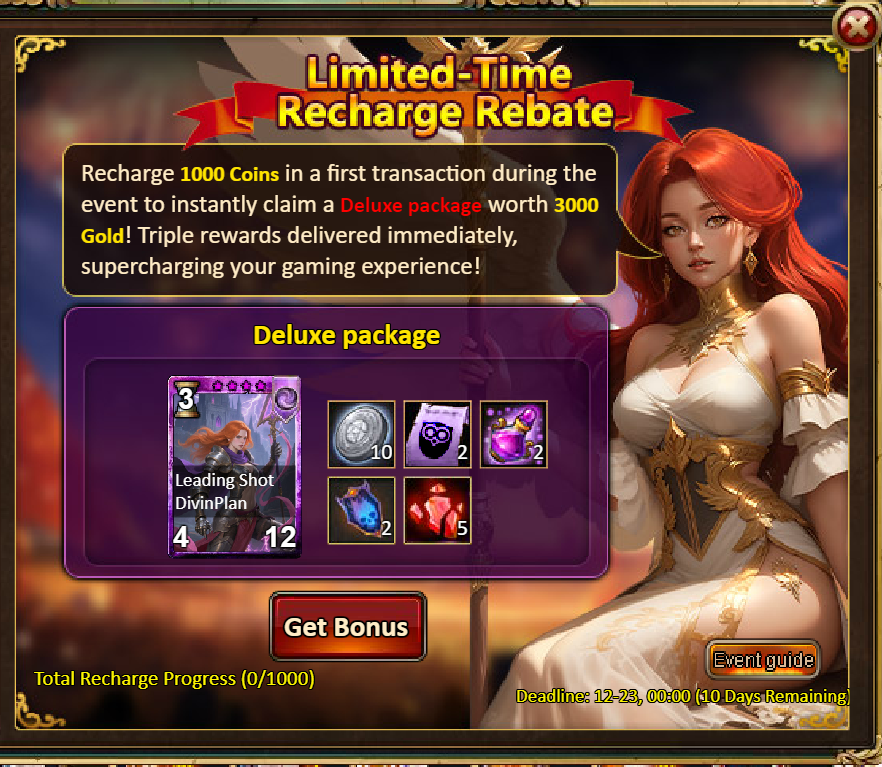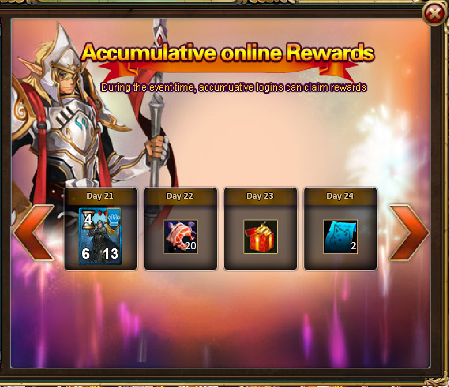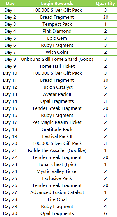 3.Recharge Rebate: Ella 'Wingclipper' (Epic) / Silver*100,000 / Pet Magic Realm Ticket*2 / Dark Champion Potion*2 / Tome Hall Ticket*2 / Ruby Fragment*5