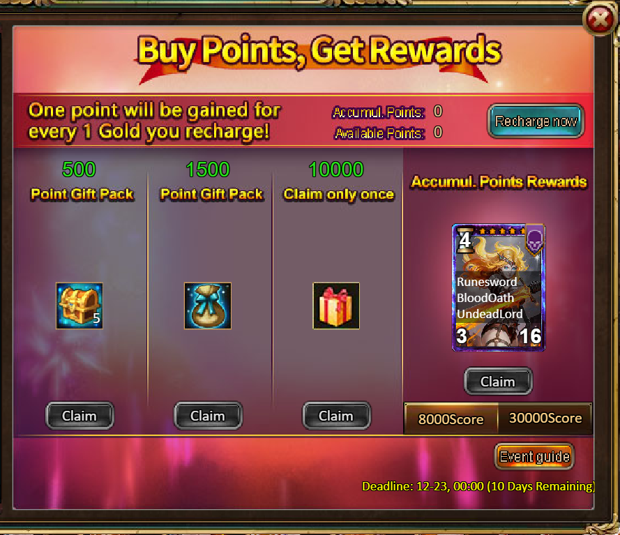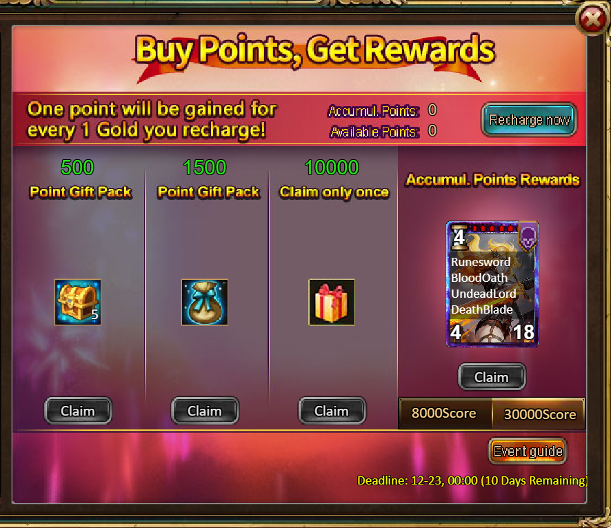 4.Buy Points, Get Rewards: 8000 - DeathBlade Fiora (Legendary)*1 / 30000 - DeathBlade Fiora (Godlike) *1
