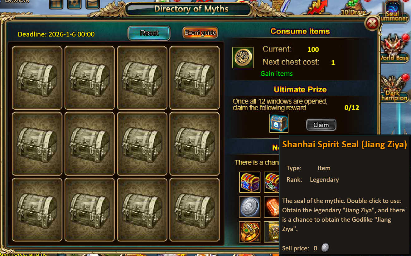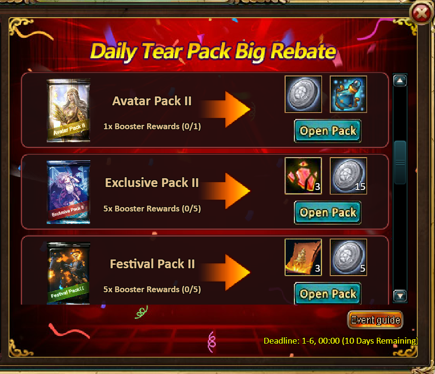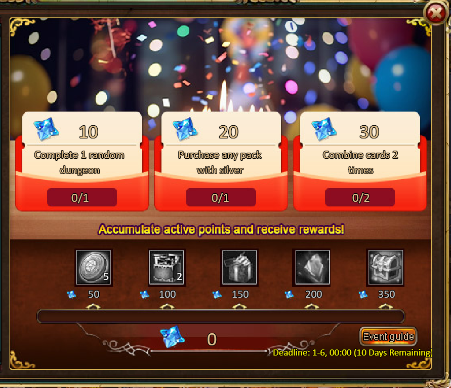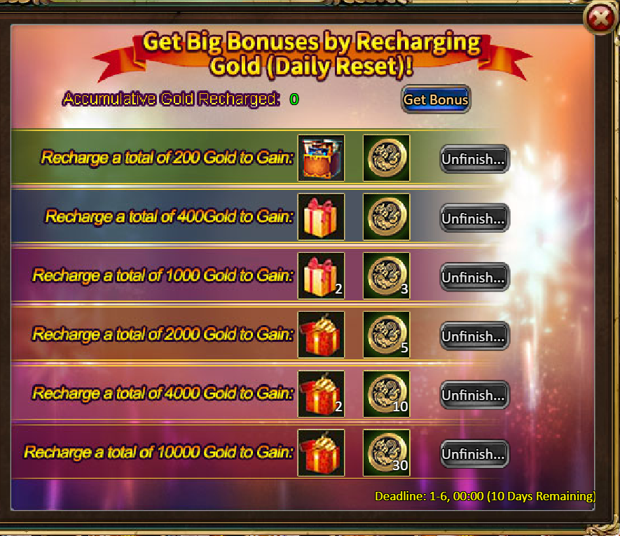 Consume 90,000 gold coins: Black Opal*1, Godlike Box II*6, Solar Chest (Legendary)*6, Silver*5,000,000[/u]
