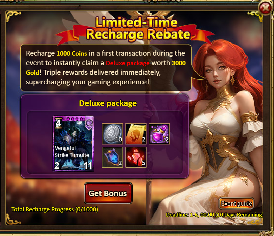 5.Cumulative Gold Rebate: 12000 - New Year Pack (Contains Ironbane Guardian (Legendary) *1 + Happy New Year Title*1)*1 / 30000 – Ironbane Guardian (Godlike)*1