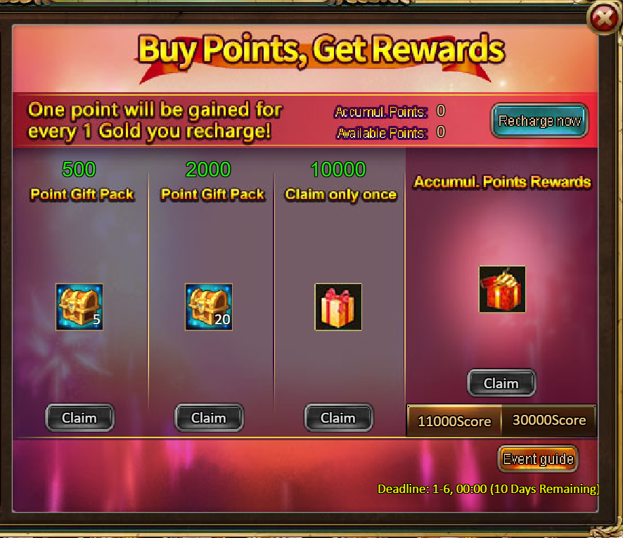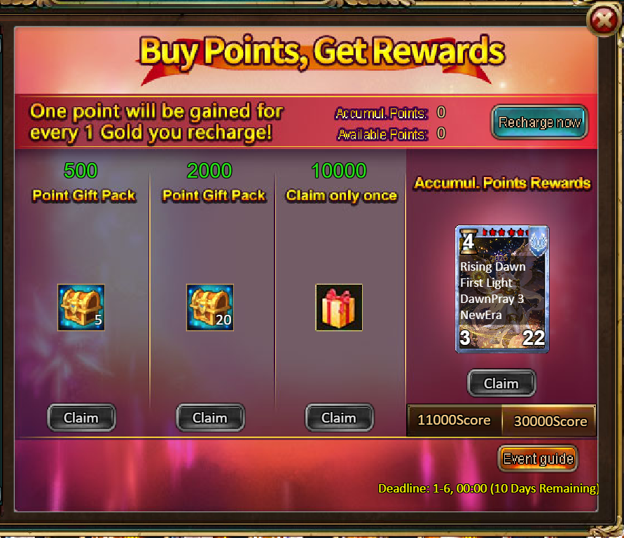 4.Buy Points, Get Rewards: 11000 - Dawn Pack (Contains Aurora, Goddess of Dawn (Legendary) *1 + Crown of Starlight (Legendary) *1) *1 / 30000 - Aurora, Goddess of Dawn (Godlike)*1