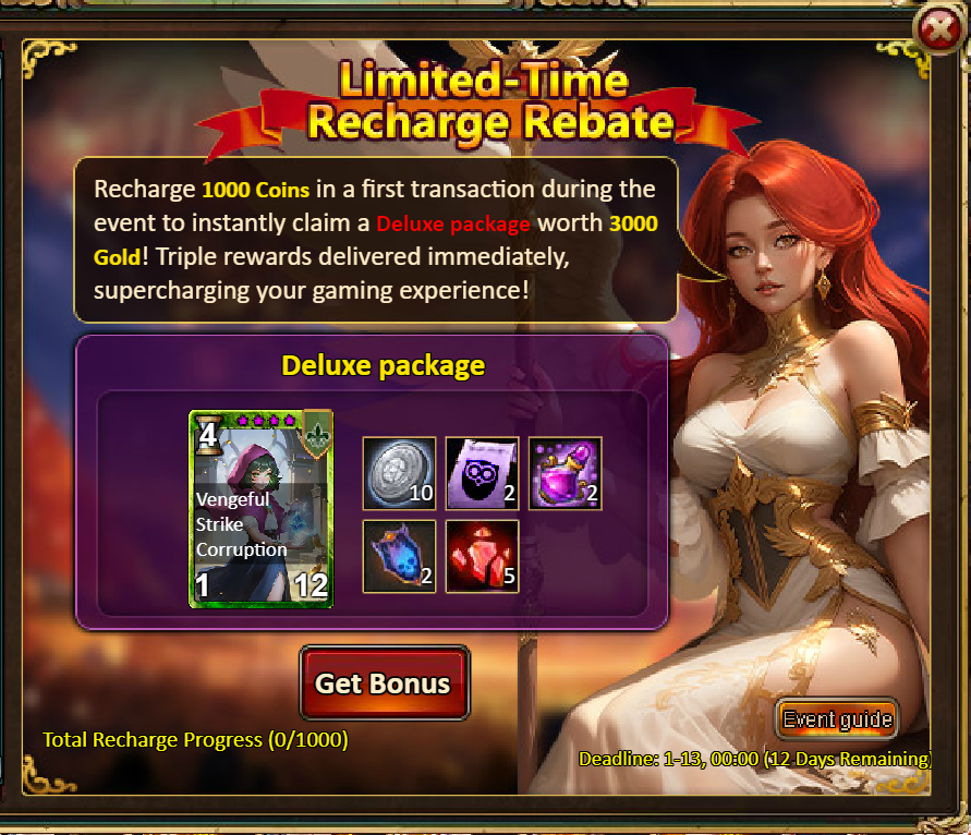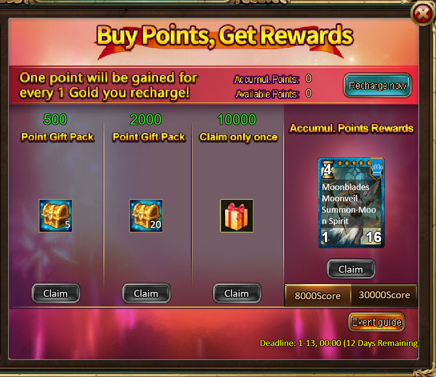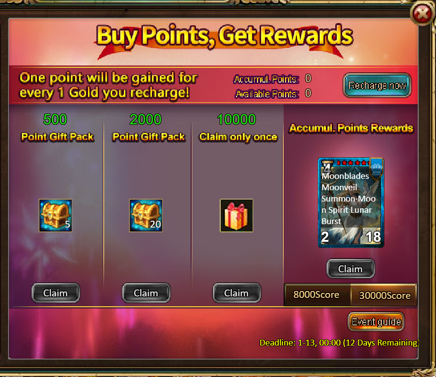 4.Buy Points, Get Rewards: 8000 - Moon Priestess (Legendary) *1 / 30000 - Moon Priestess (Godlike)*1