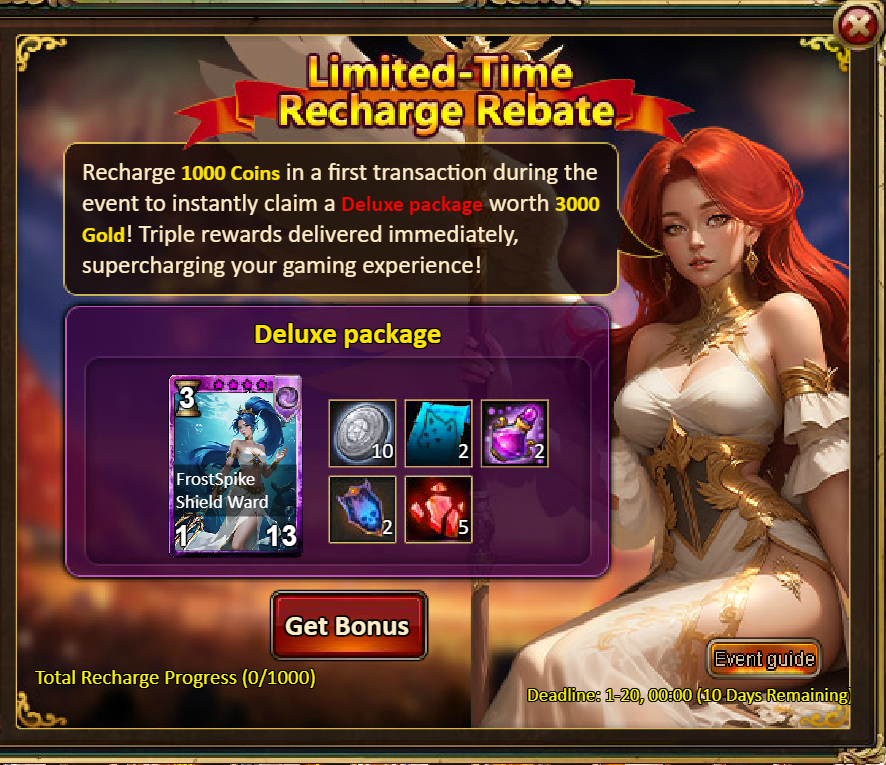 3.Recharge Rebate: Scepter Reef (Epic)*1 / Silver*100,000 / Mystic Valley Ticket*2 / Dark Champion Potion*2 / Tome Hall Ticket*2 / Ruby Fragment*5