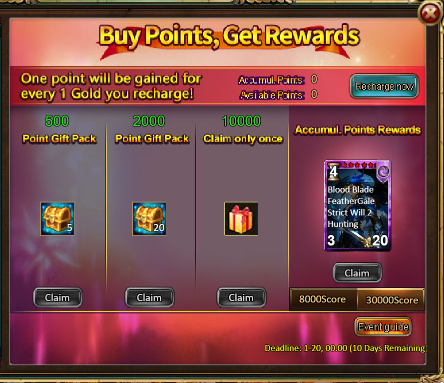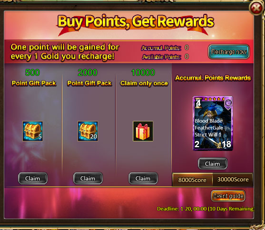 4.Buy Points, Get Rewards: 8000 - Brynhildr (Legendary) *1 / 30000 - Brynhildr (Godlike)*1