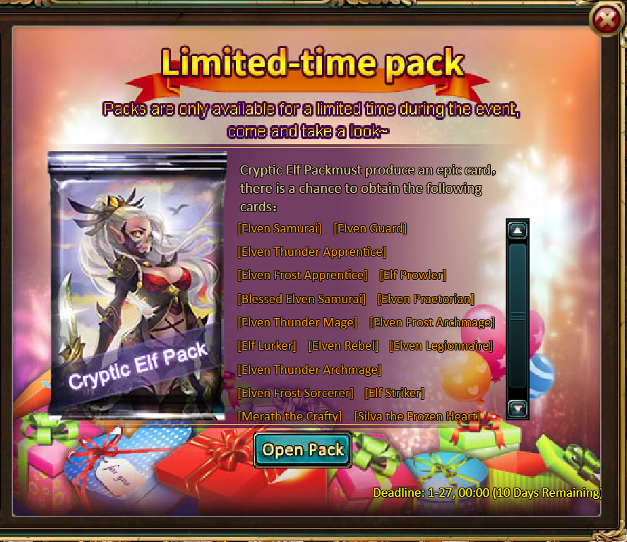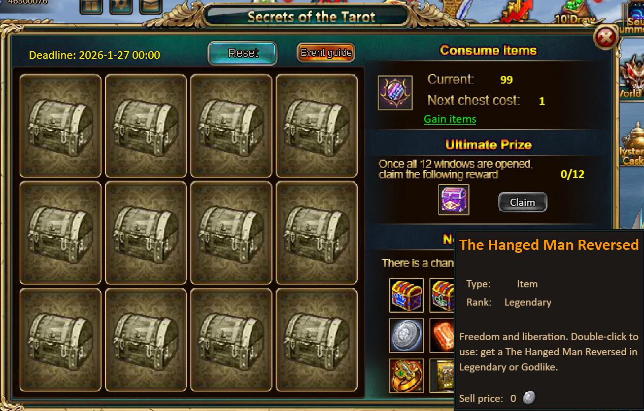 Consume 90,000 gold coins: Black Opal*1, Godlike Box II*6, Solar Chest (Legendary)*6, Silver*5,000,000[/u]