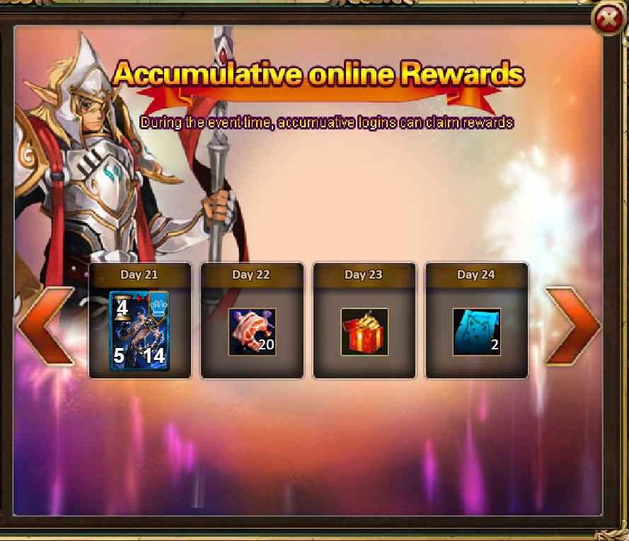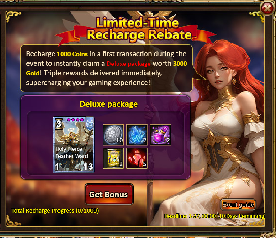 3.Recharge Rebate: Blaze Wing Envoy (Epic) / Silver*100,000 / Crystal Gift Pack*2 / Dark Champion Potion*2 / Master Skill Pack II*2 / Ruby Fragment*5