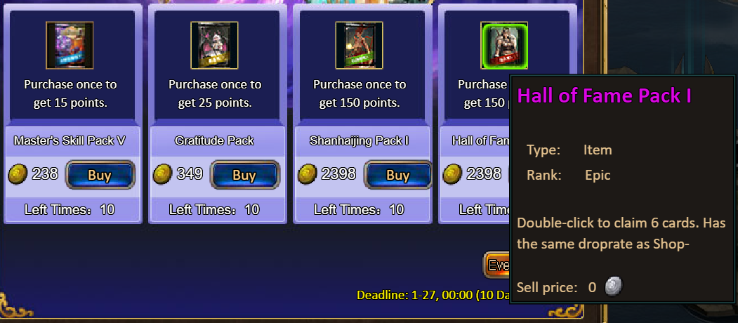 Consume 5,000 gold coins: Crystal Gift Pack*3, Unbound Skill Tome Shard (Good)*10, Fire Opal*1