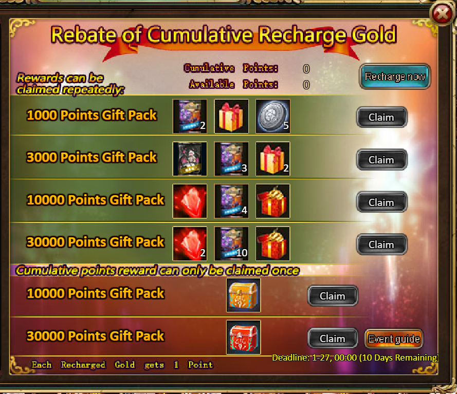 5.Cumulative Gold Rebate: 10000 - Kaynie (Legendary) *1 / 30000 - Kaynie (Godlike)*1