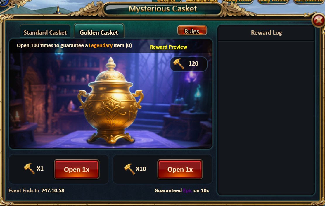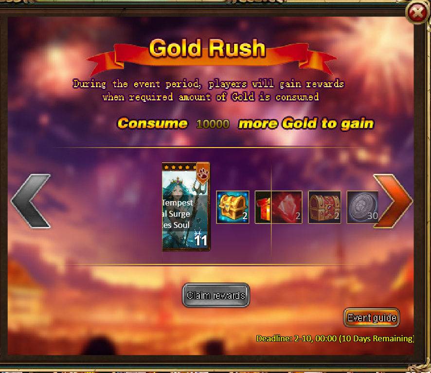 Consume 50,000 gold coins: Black Opal*1, Solar Chest (Legendary)*4, Pet Pleasure*5