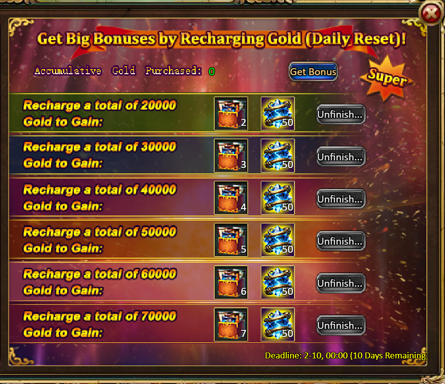 Consume 30,000 gold coins: Fire Ruby*2, Godlike Box II*2, Silver*3,000,000