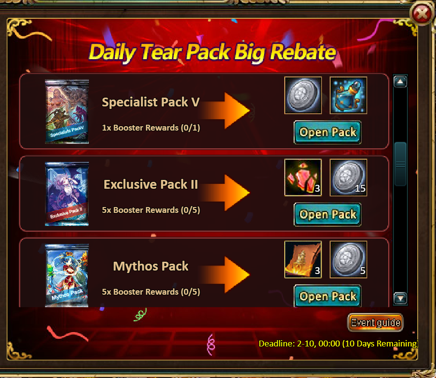 5 packs of Brave Pack - Tome Hall Ticket*2 / Elixir of Energy (10 Points)*3 / Silver*300,000