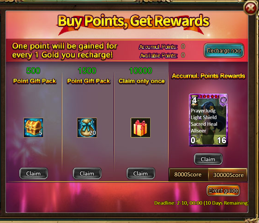 4.Buy Points, Get Rewards: 8000 - Moonlit Vine (Legendary)*1 / 30000 - Moonlit Vine (Godlike)*1