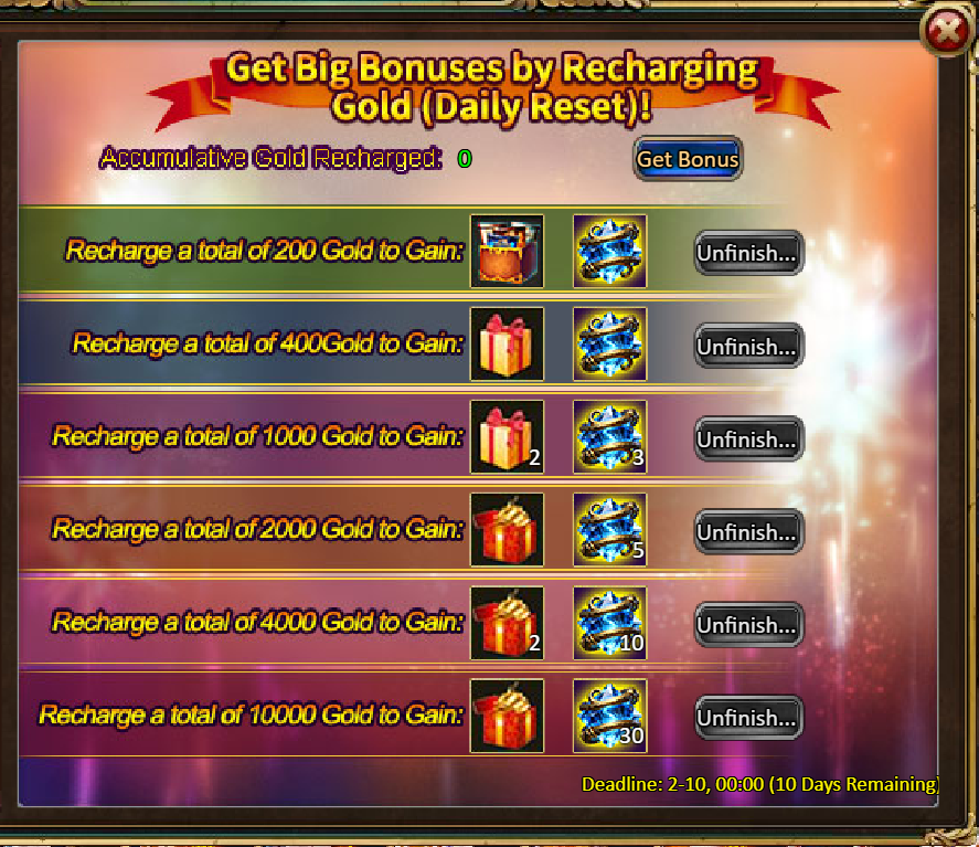3.Recharge Rebate: Starlight Ballad (Epic) / Silver*100,000 / Crystal Gift Pack*2 / Dark Champion Potion*2 / Master Skill Pack II*2 / Ruby Fragment*5 / Golden Hammer*5