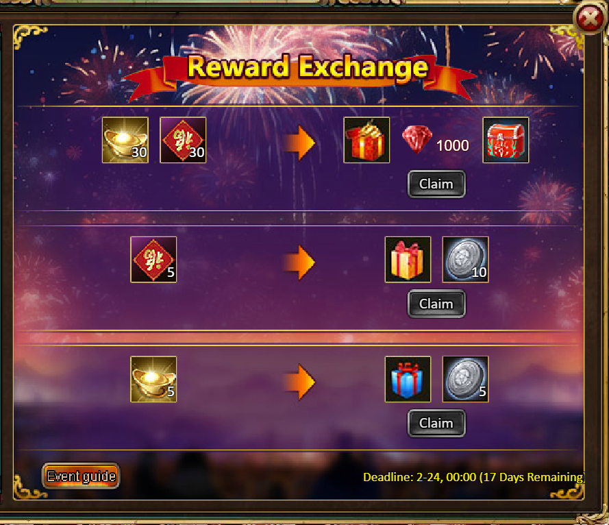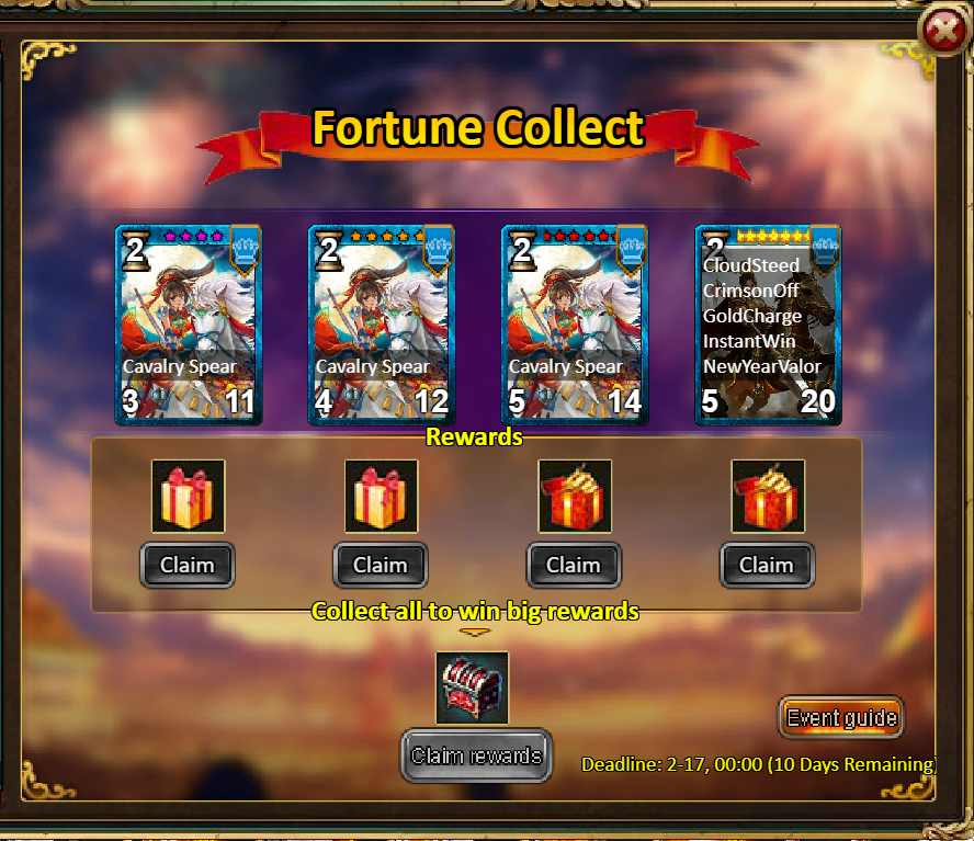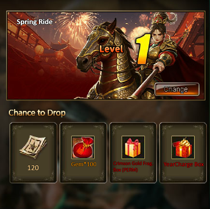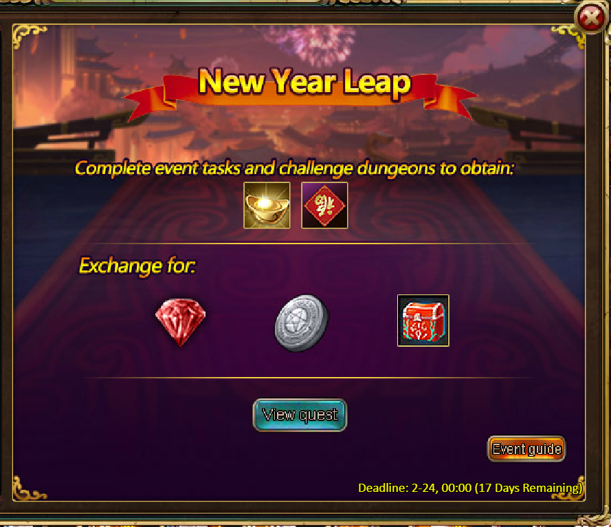 [b]Rewards: New Year Pack*1, New Year Material Pack*1, Silver*500,000, Inferno Ticket*10, Ticket Pack*2, Opal Fragment*5[/b]