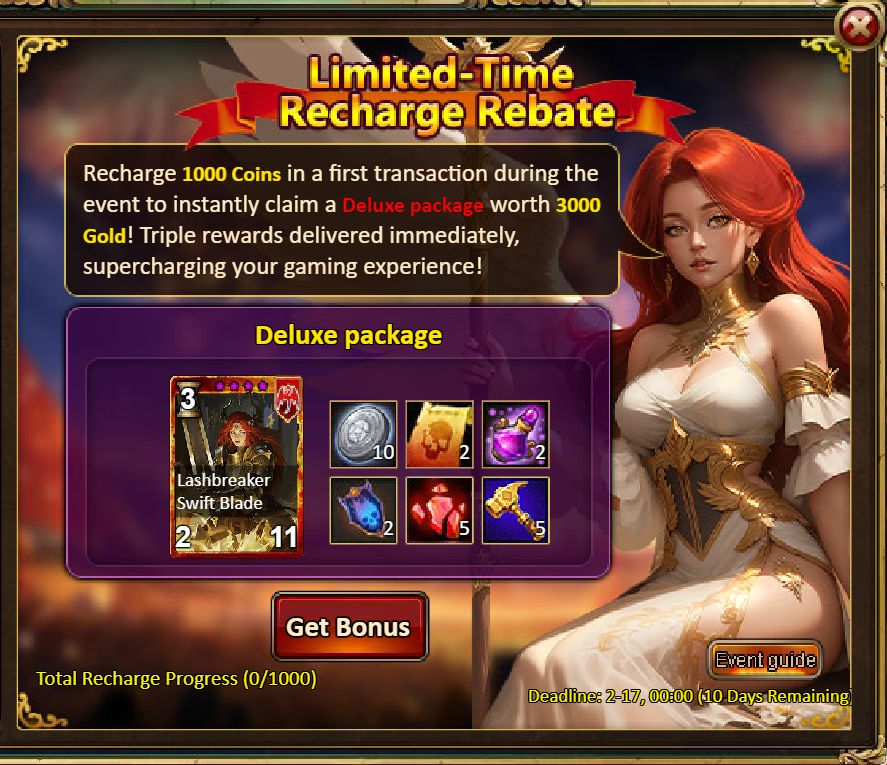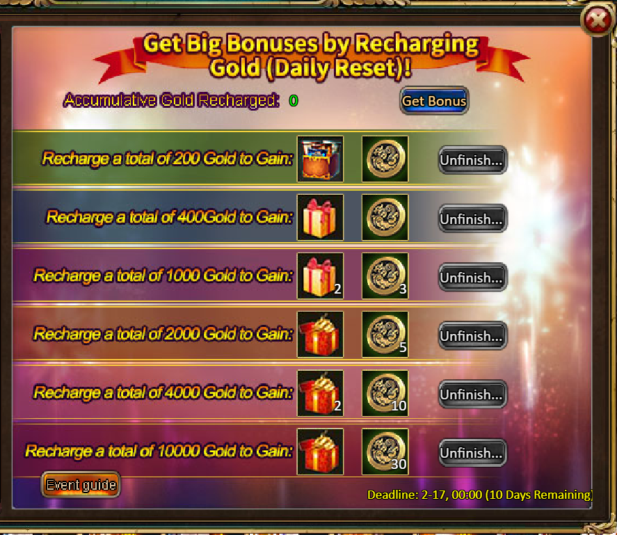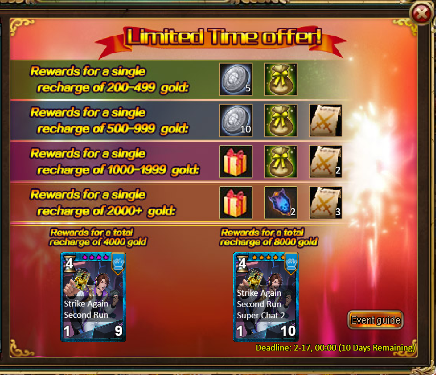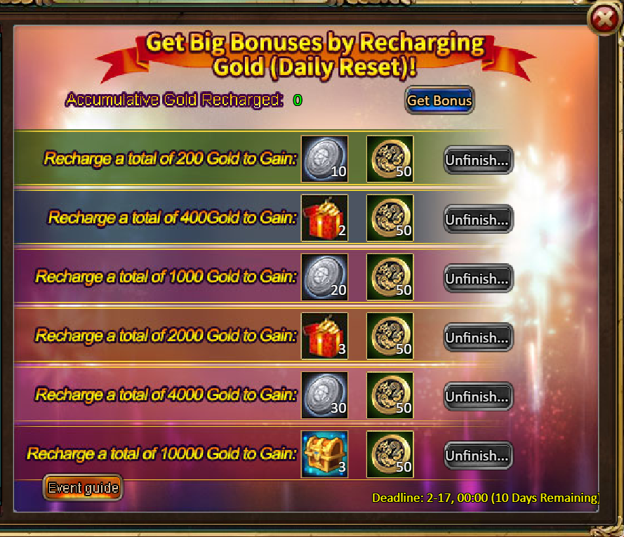 3.Recharge Rebate: Emberguard (Epic)*1 / Silver*100,000 / Chaotic Wastes Ticket*2 / Dark Champion Potion*2 / Tome Hall Ticket*2 / Ruby Fragment*5 / Golden Hammer*5