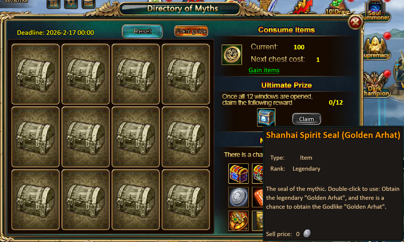 Consume 90,000 gold coins: Black Opal*1, Godlike Box II*6, Solar Chest (Legendary)*6, Silver*5,000,000[/u]