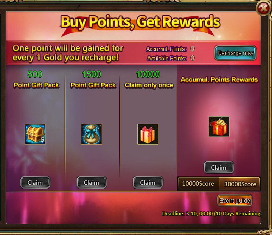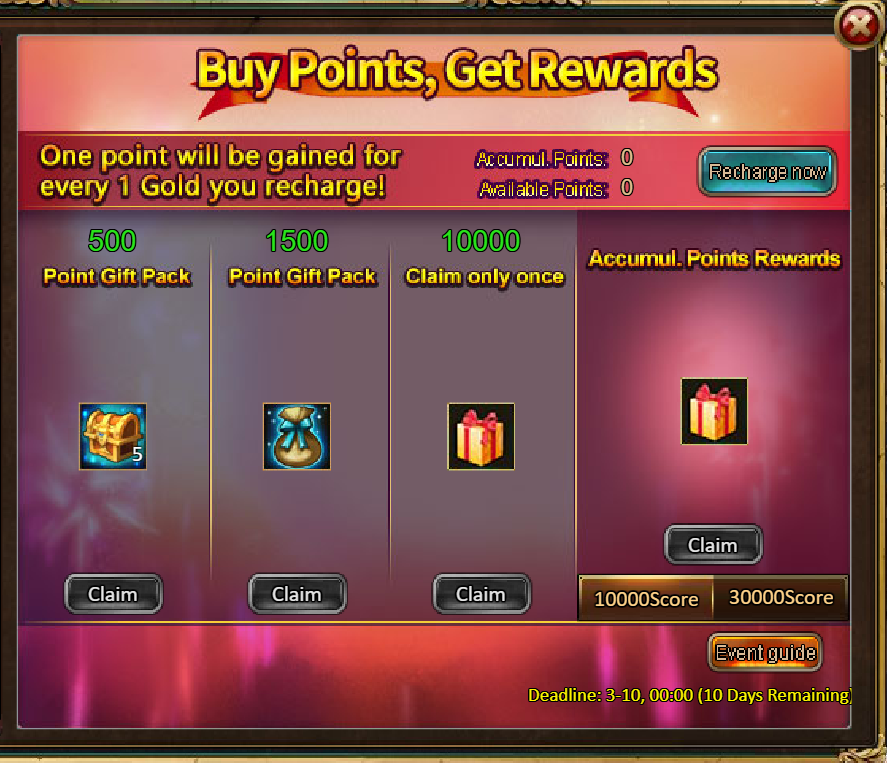 4.Buy Points, Get Rewards: 10000 - Legendary Frost Prism Chest (contains Frost Prism (Legendary)*1, Golden Hammer*40) *1 / 30000 - Godlike Frost Prism Chest (contains Frost Prism (Godlike)*1, Golden Hammer*60) *1