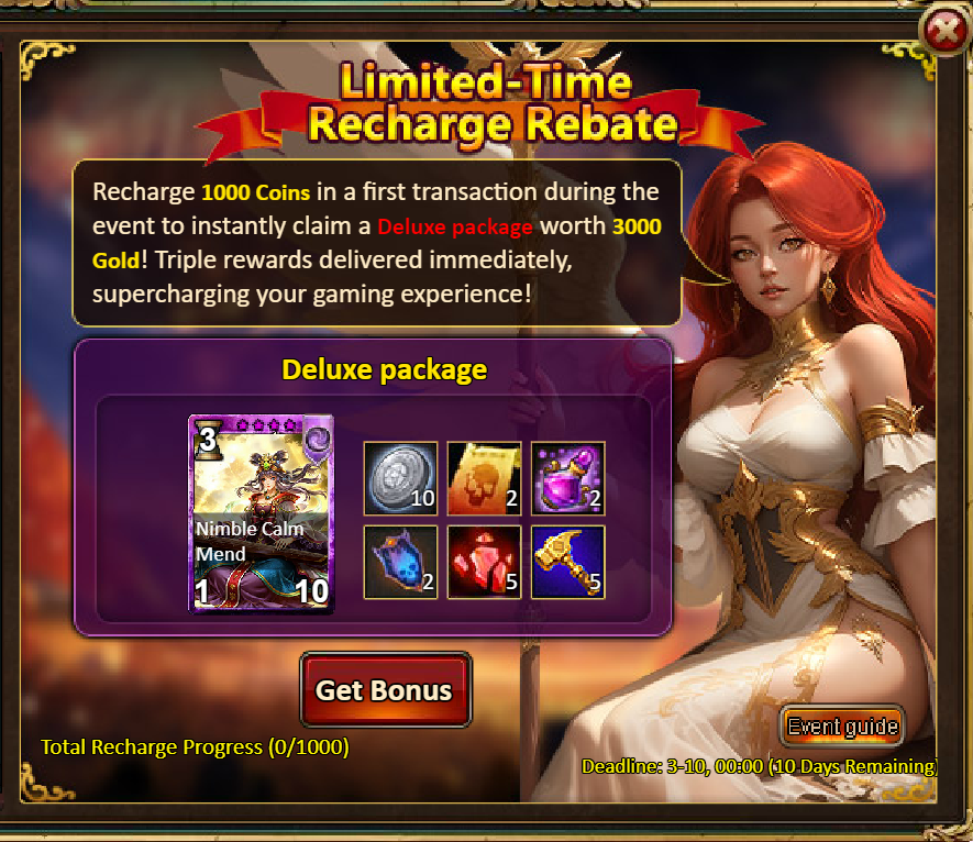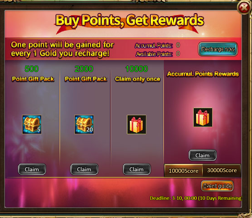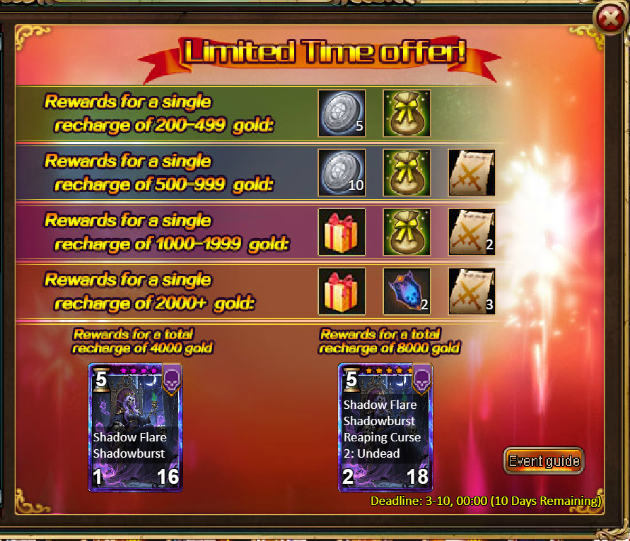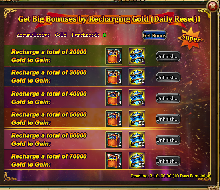 3.Recharge Rebate: Dawn Redeemer (Epic)*1 / Silver*100,000 / Chaotic Wastes Ticket*2 / Dark Champion Potion*2 / Tome Hall Ticket*2 / Ruby Fragment*5 / Gold Tree*1