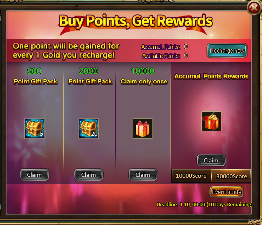 4.Buy Points, Get Rewards: 10000 - Legendary Frost Prism Chest (contains Frost Prism (Legendary)*1, Golden Hammer*40) *1 / 30000 - Godlike Frost Prism Chest (contains Frost Prism (Godlike)*1, Golden Hammer*60) *1