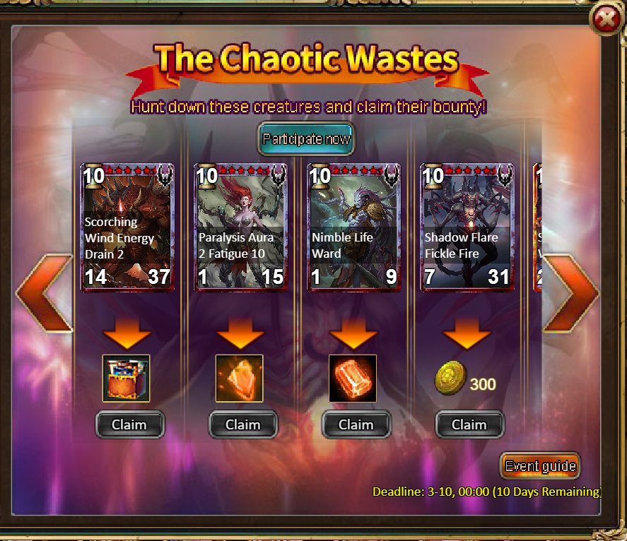 Consume 5,000 gold coins: Chaotic Wastes Ticket*3, Unbound Skill Tome Shard (Good)*10, Fire Opal*1