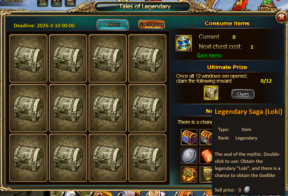 Consume 90,000 gold coins: Black Opal*1, Godlike Box II*6, Solar Chest (Legendary)*6, Silver*5,000,000[/u]