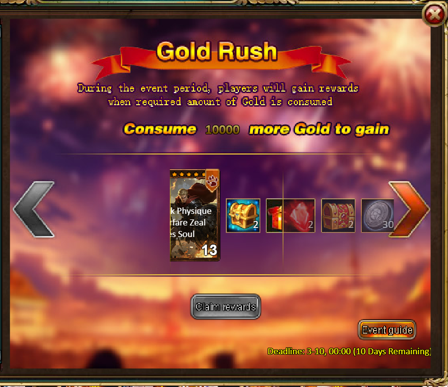 Consume 30,000 gold coins: Fire Ruby*2, Godlike Box II*2, Silver*3,000,000