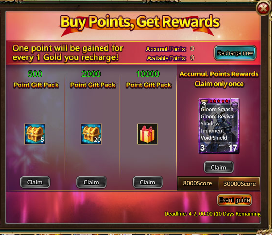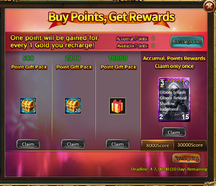 4.Buy Points, Get Rewards: 8000 - Gloom Celestia (Legendary)*1 / 30000 - Gloom Celestia (Godlike) *1